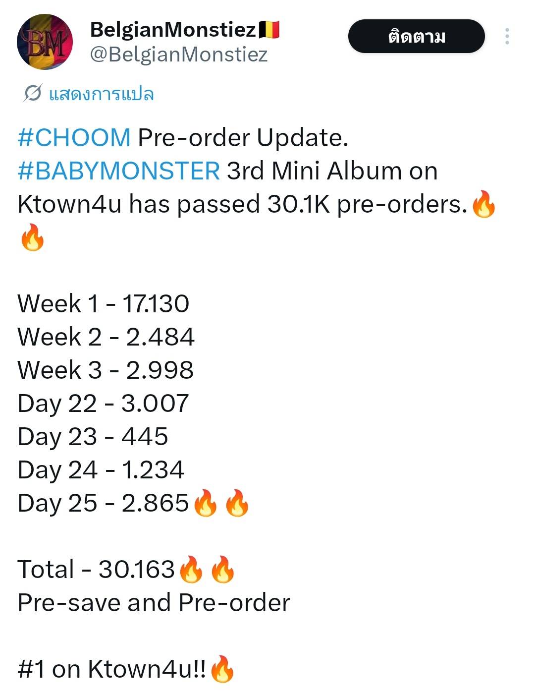BABYMONSTER 3rd Mini Album CHOOM ตอนนี้มียอด Pre-order บนเว็บ Ktown4u ทะลุ 30,000 อัลบั้มเป็นที่เรียบร้อยแล้ว โดยยอดรวม