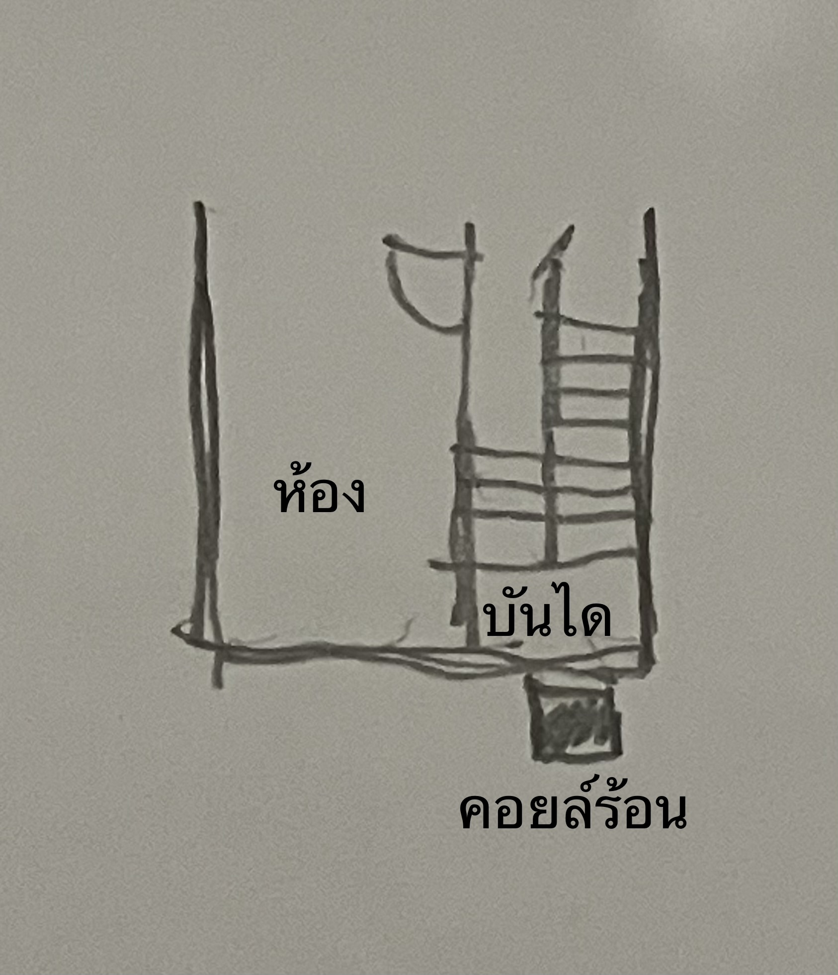 ระดับความสูงชานพักบันได 4 ขั้น เกือบเท่ากับกรอบหน้าต่างด้านล่าง ถ้าวางคอยล์แอร์ ไว้ที่ตำแหน่งนี้