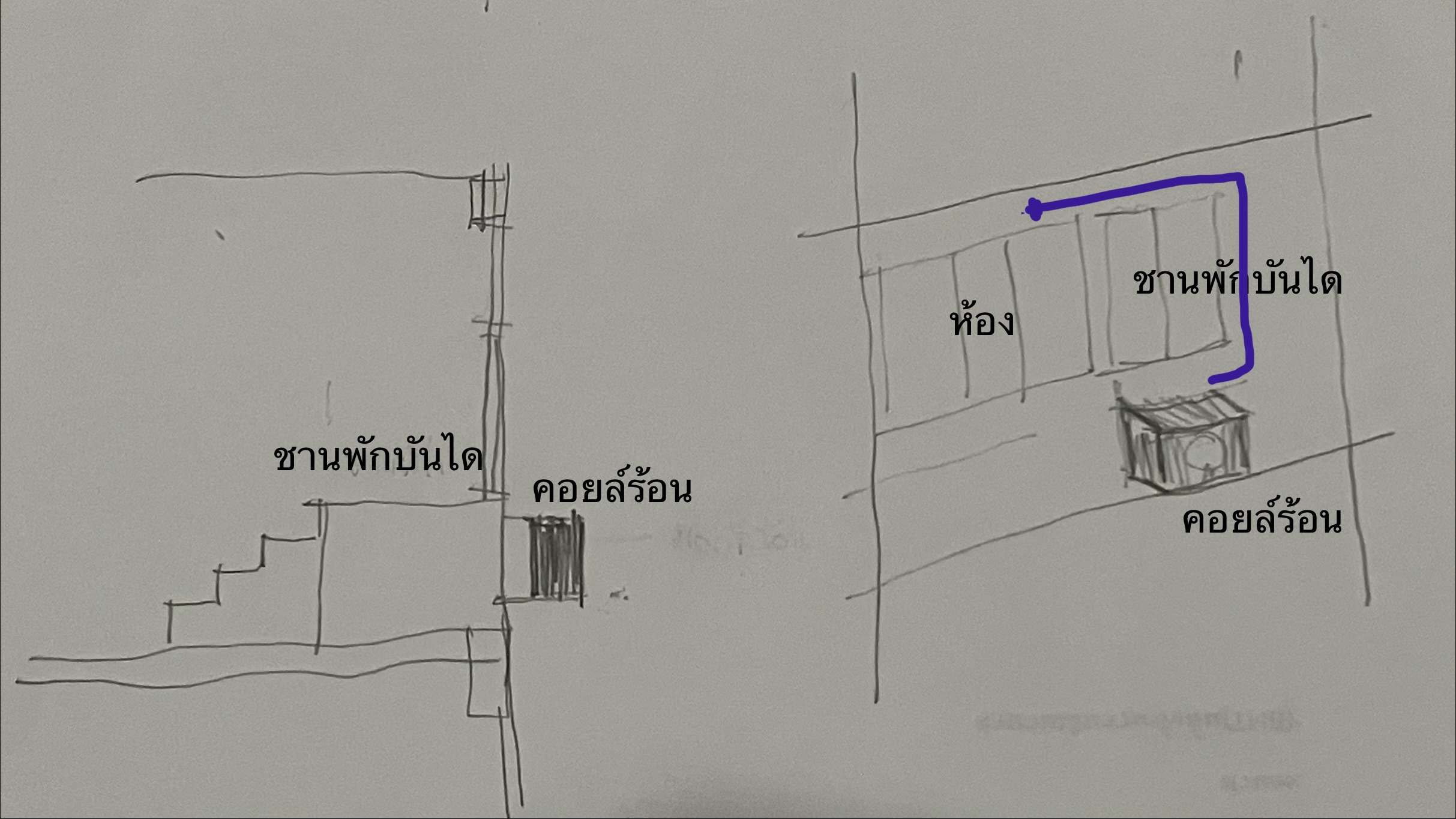 3. ในการล้างแอร์ ล้างคอยล์ร้อนจะทำได้อย่างไร? ตำแหน่งที่บ้านจากภาพที่วาดไว้ ช่างล้างแอร์สามารถนอนราบบนพื้นชานพัก ยื่นมืออกไป ล้างพัดลมคอยล์ร้อนได้ไหม?