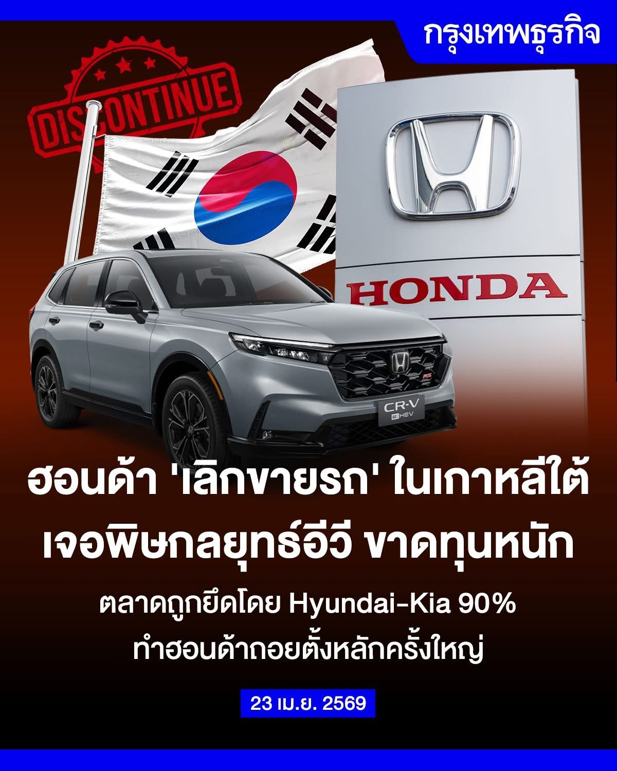 นิกเกอิ เอเชียรายงานว่า บริษัทค่ายรถ “Honda Motor” ประกาศว่า จะ “ยุติการจำหน่าย” รถยนต์ในเกาหลีใต้ภายในสิ้นปี 2026 หลังเผชิญภาวะขาดทุนหนักจากการปรับกลยุทธ์รถยนต์ไฟฟ้า