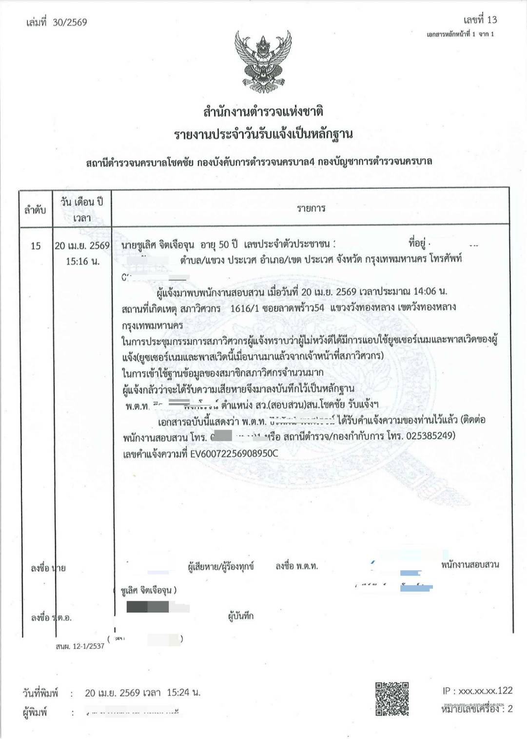 23 เม.ย. 2569 : เฟซบุ๊ก ชูเลิศ จิตเจือจุน วุฒิวิศวกรโยธา โพสต์พร้อมใบแจ้งความพร้อมระบุว่า