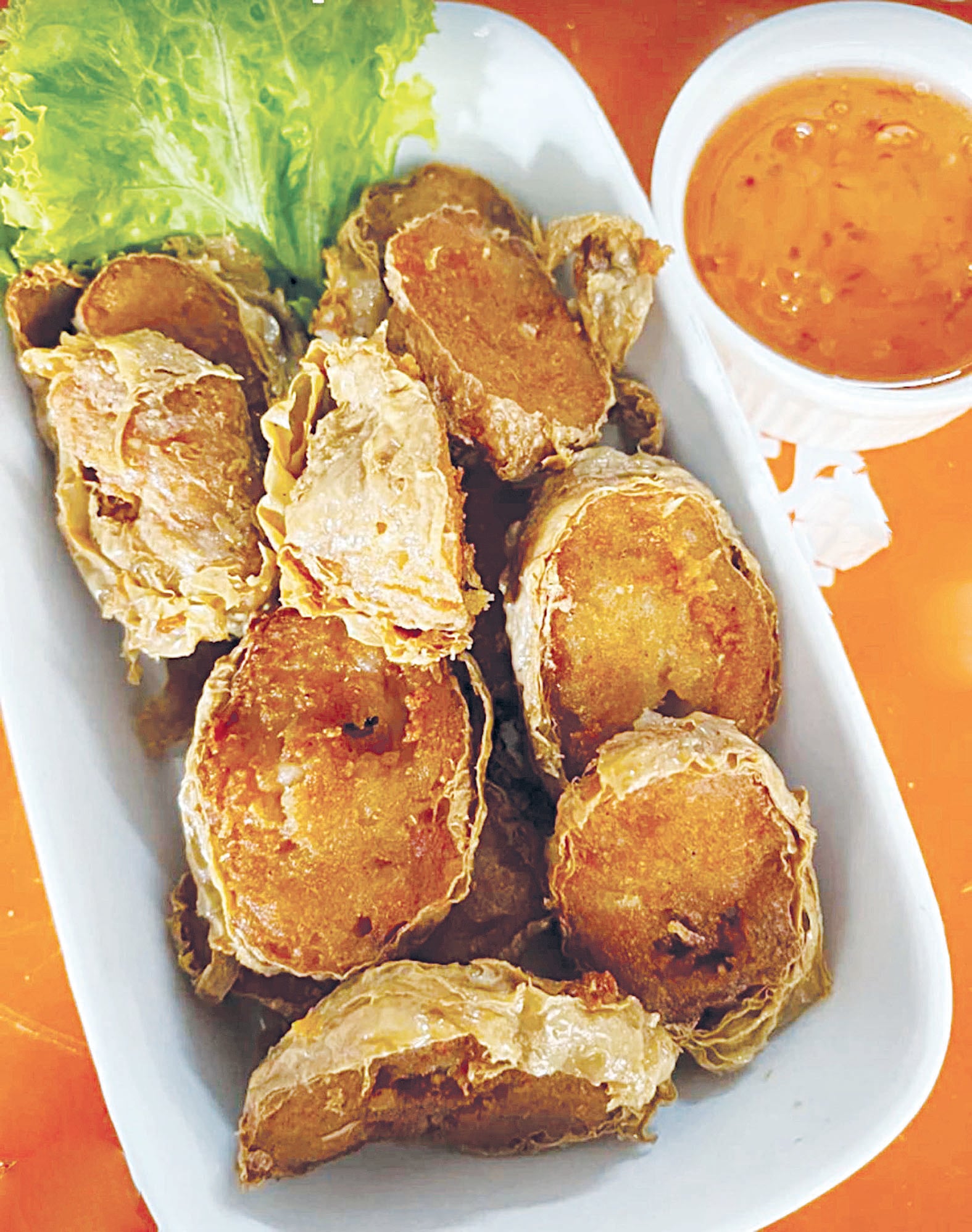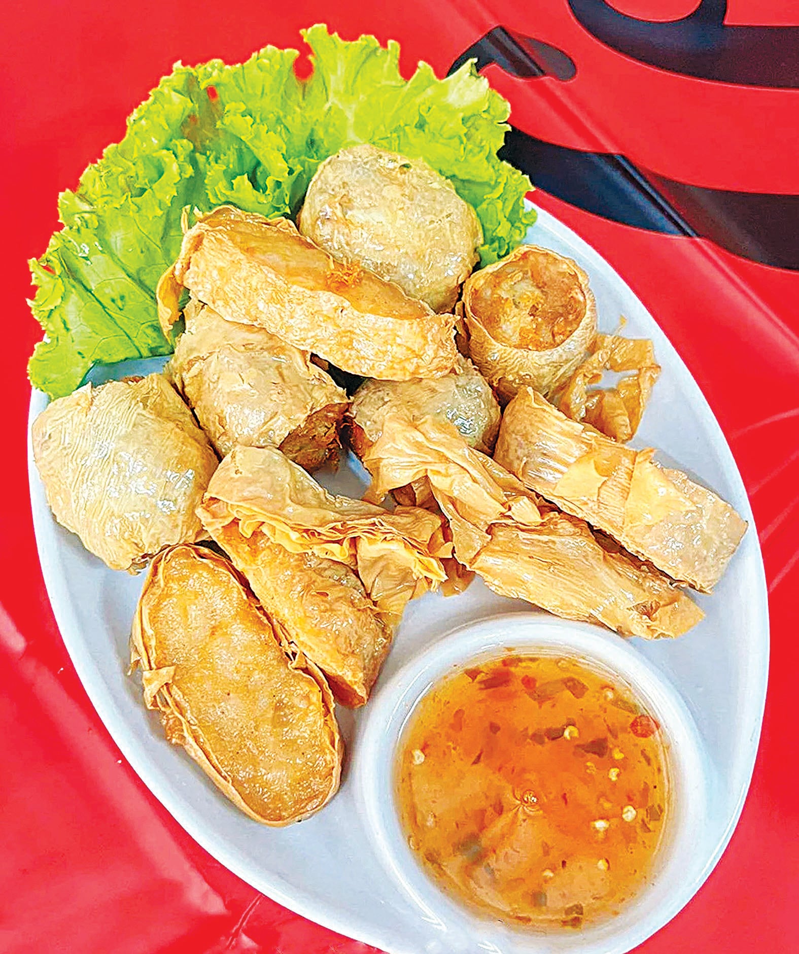 ทอดเป็นกับแกล้มให้ลูกค้าได้กินก่อน ใช้เนื้อปูและกุ้งทะเลอัดแน่นอร่อย ก๋วยเตี๋ยวน้ำแดงวงเวียนน้ำพุ(เจ๊กเม้ง)