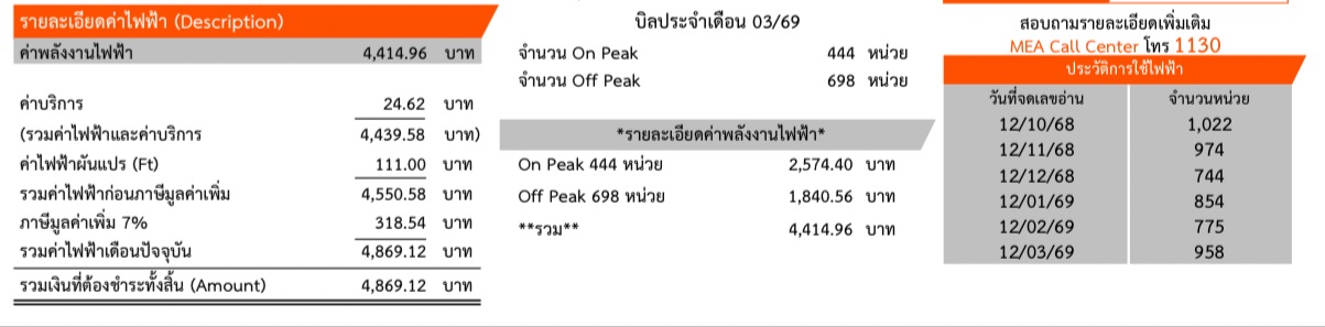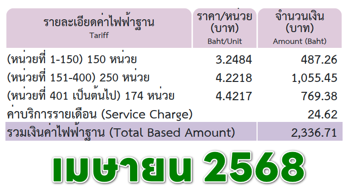 ค่าไฟฟ้าเฉลี่ย: 3.95 บาทต่อหน่วย (ยังไม่รวมภาษีมูลค่าเพิ่ม)