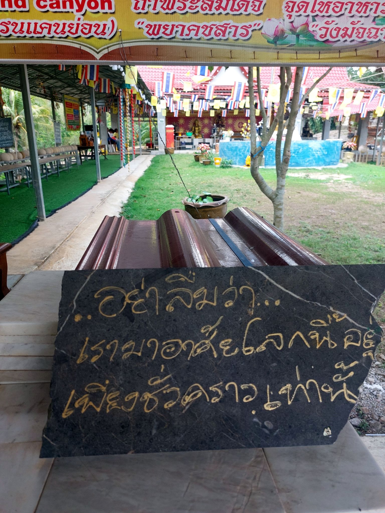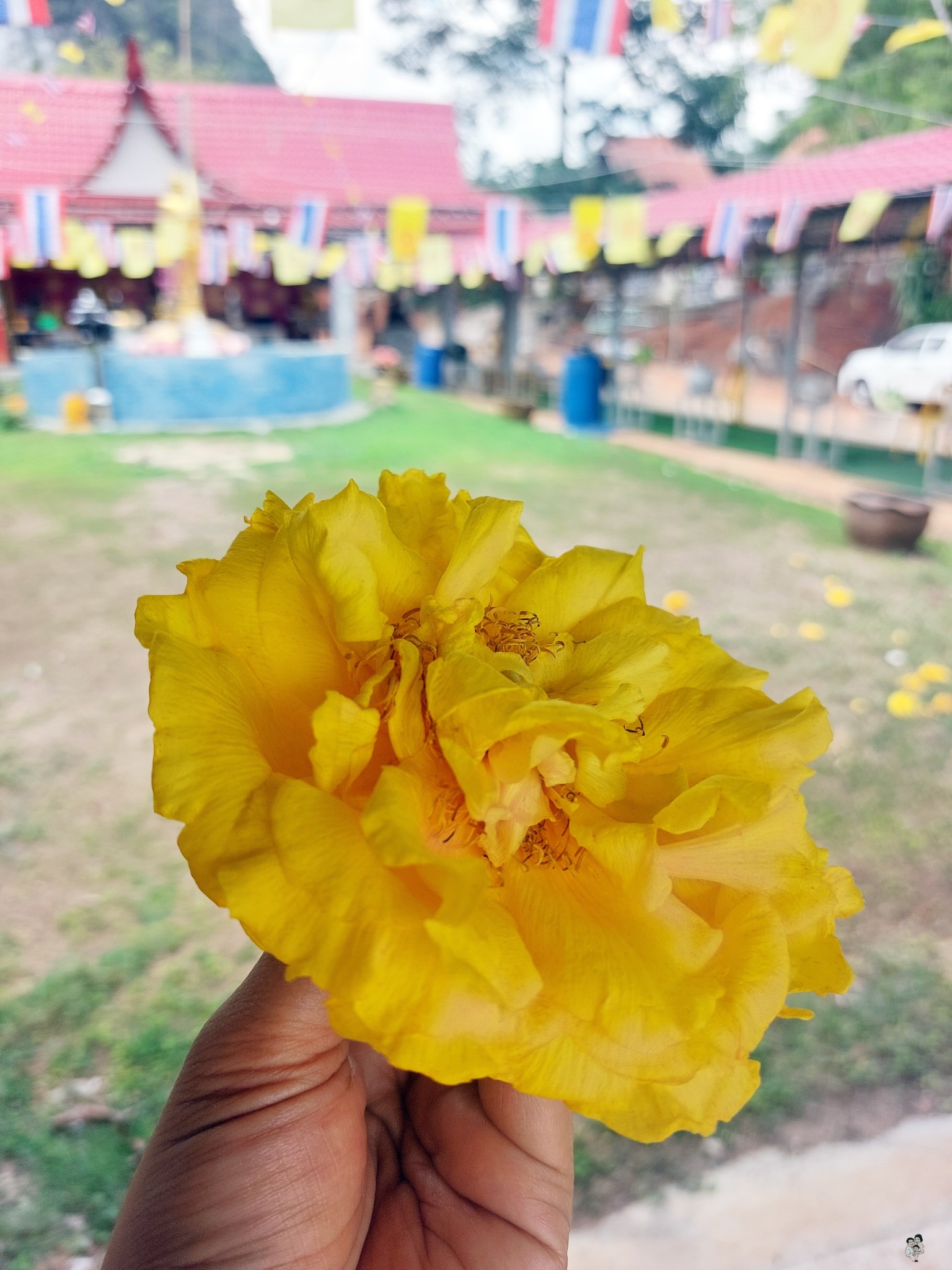 ไหว้พระเพื่อความเป็นสิริมงคล เจอดอกไม้หล่นใต้ต้นสวยมาก อดที่จะหยิบขึ้นมาถ่ายรูปไม่ได้
