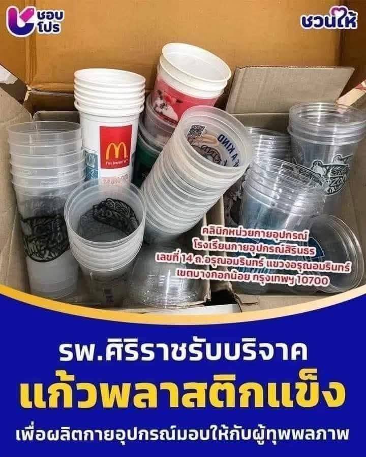 ร่วมบริจาคแก้วน้ำพลาสติกแข็ง ๆ เพื่อทำขาเทียมค่ะ