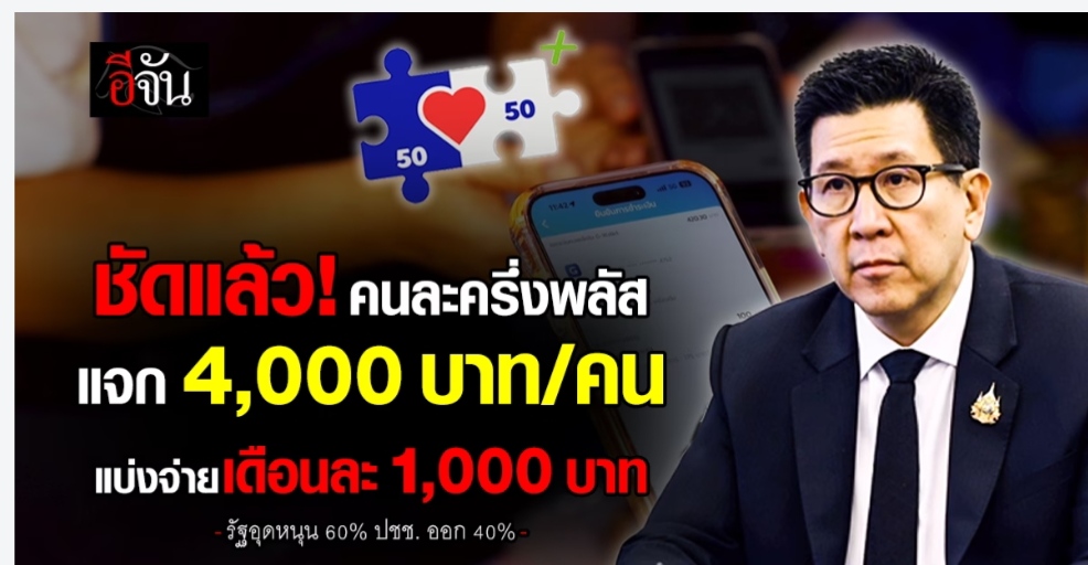 “เอกนิติ” ตอบชัด แจก “คนละครึ่งพลัส” 4,000 บาท/คน แบ่งจ่ายเดือนละ 1,000 บาท รัฐอุดหนุน 60% ปชช. ออก 40% เริ่มลงทะเบียนเดือนพ.ค. และเริ่มใช้สิทธิเดือนมิ.ย. 69