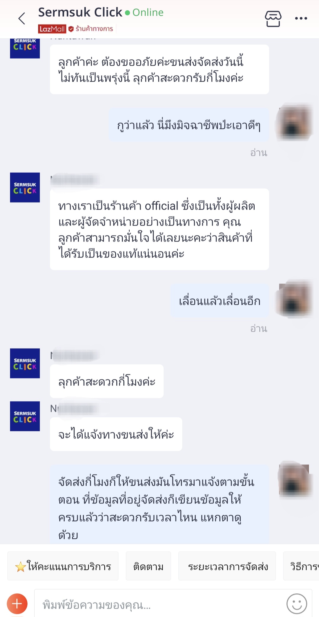คือมันเสียเวลาเรามากๆ ของมาช้าก็พอทน แต่นัดหมายเราว่าของจะมาส่งแล้วเงียบหายแล้วเลื่อนไปเรื่อยๆ เราก็ต้องเตรียมตัวรอรับของ รอเปิดประตูรอเอาของเข้าบ้าน ถ้าไม่รอรับก็จะว่าเราอีก จะให้เอาของกองไว้นอกบ้านก็ไม่ได้ บริษัทให้โตแต่ทำงานชุ่ยมาก แอดมินก็ไร้ประโยชน์ให้ข้อมูลอะไรก็ไม่ได้