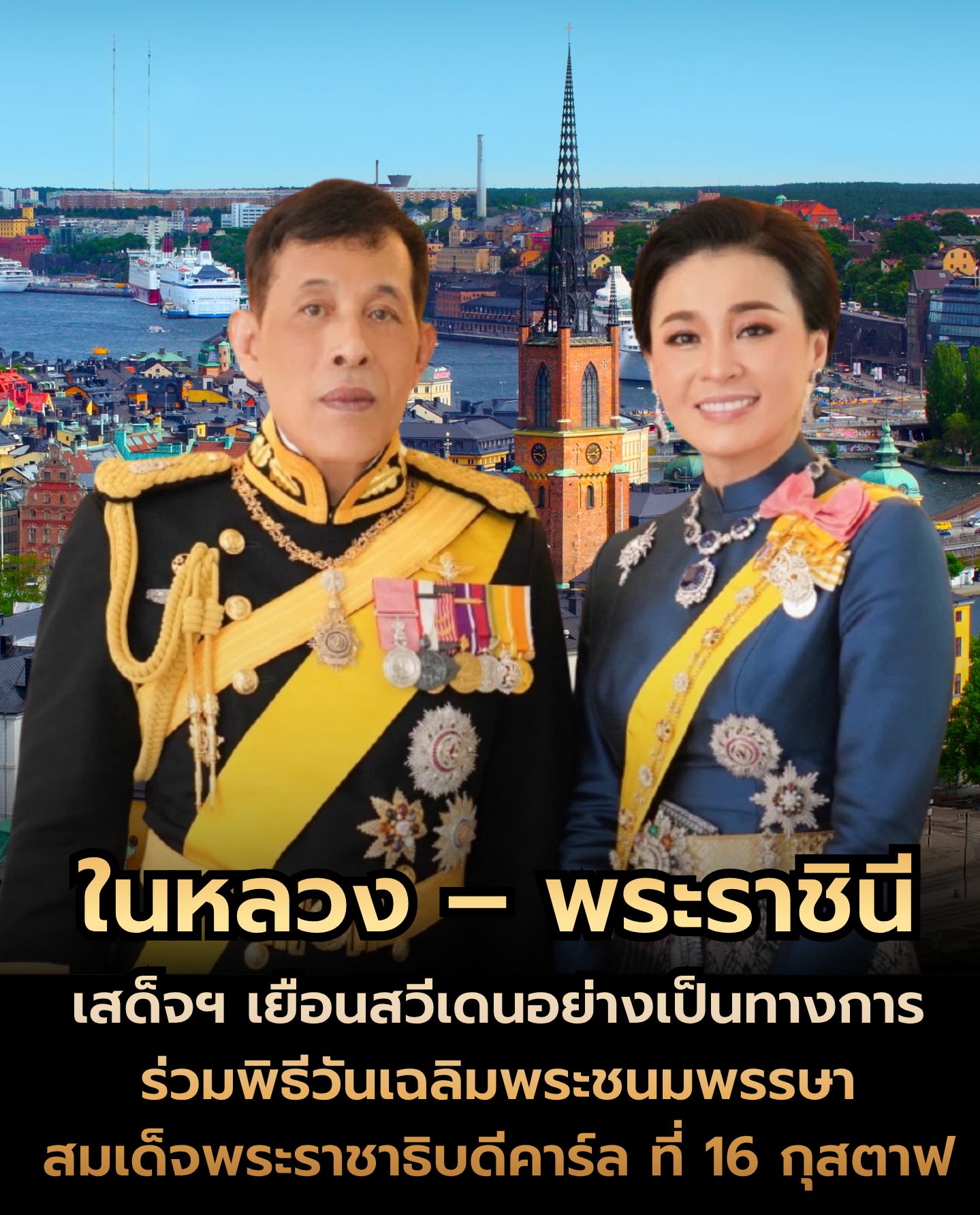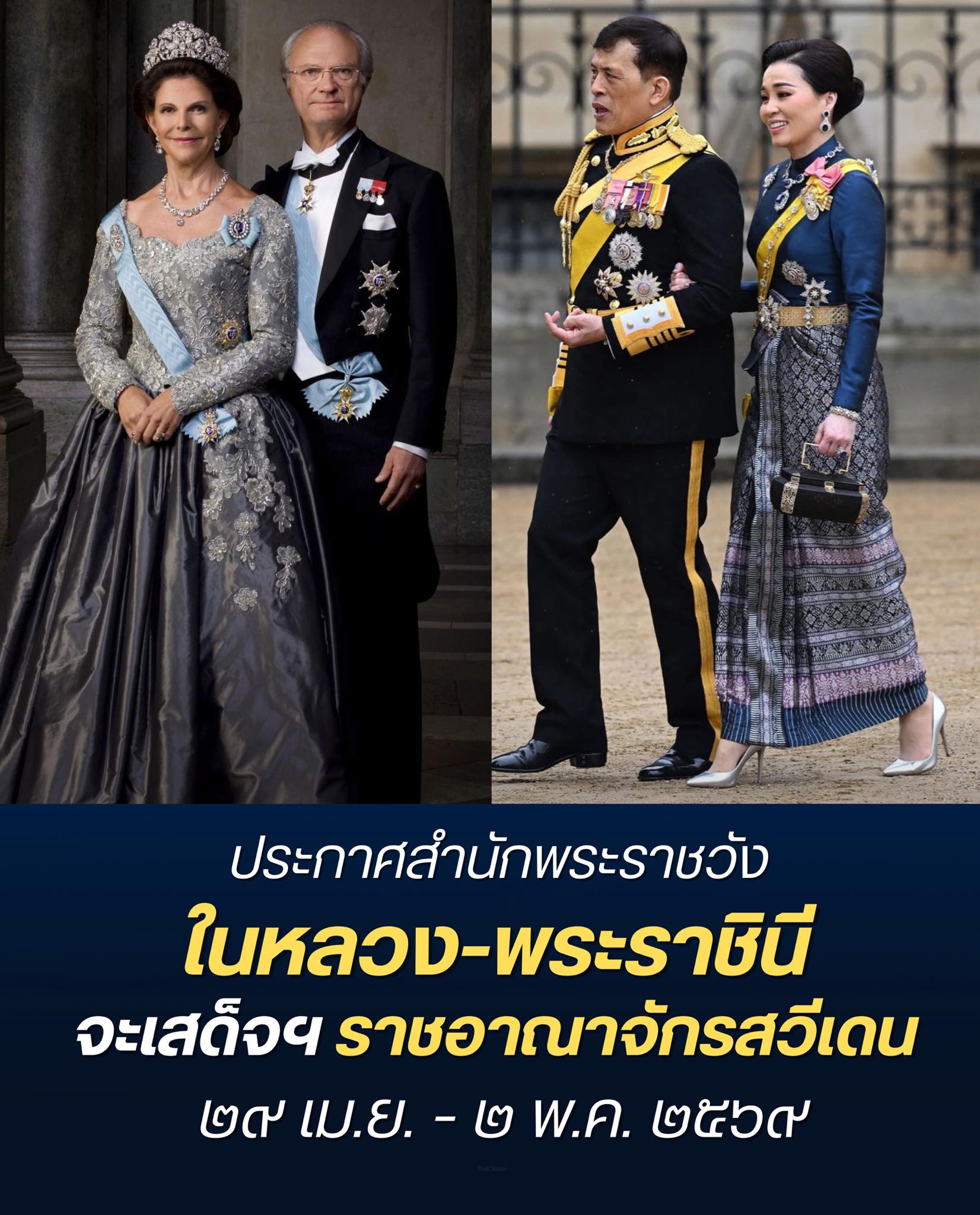 เรื่อง พระบาทสมเด็จพระเจ้าอยู่หัว และสมเด็จพระนางเจ้าฯ พระบรมราชินี จะเสด็จฯ เยือนราชอาณาจักรสวีเดน ระหว่างวันที่ ๒๙ เมษายน - วันที่ ๒ พฤษภาคม พ.ศ. ๒๕๖๙ ตามคำทูลเชิญของสมเด็จพระราชาธิบดีคาร์ลที่ ๑๖ กุสตาฟ แห่งสวีเดน เพื่อทรงร่วมงานพระราชพิธีเนื่องในโอกาส วันคล้ายวันพระราชสมภพครบ ๘๐ พรรษา ของสมเด็จพระราชาธิบดีคาร์ลที่ ๑๖ กุสตาฟ แห่งสวีเดน