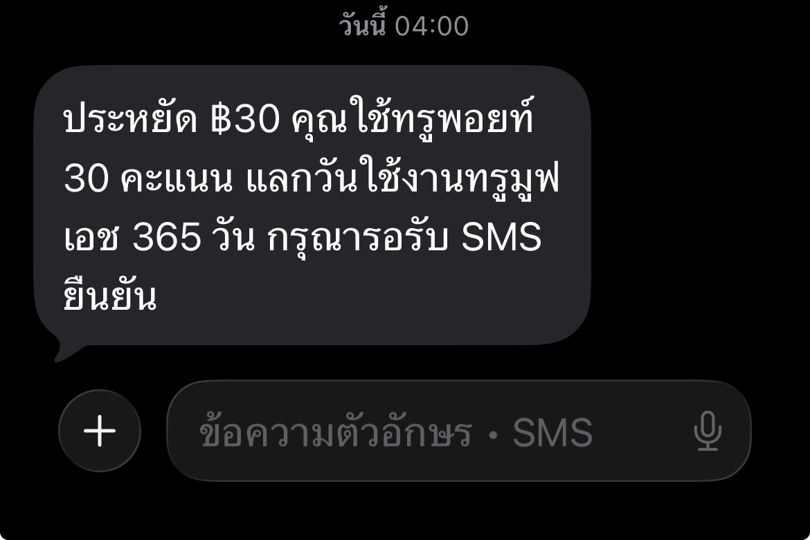 เติมวันใช้งานทรูมูฟเอชด้วยการแลกพอยท์คะแนนสะสม ปกติต้องรอsmsยืนยันกี่วันคะ ? แต่ระบบหักคะแนนไปแล้วยังไม่ได้รับsmsเลยค่ะ😢