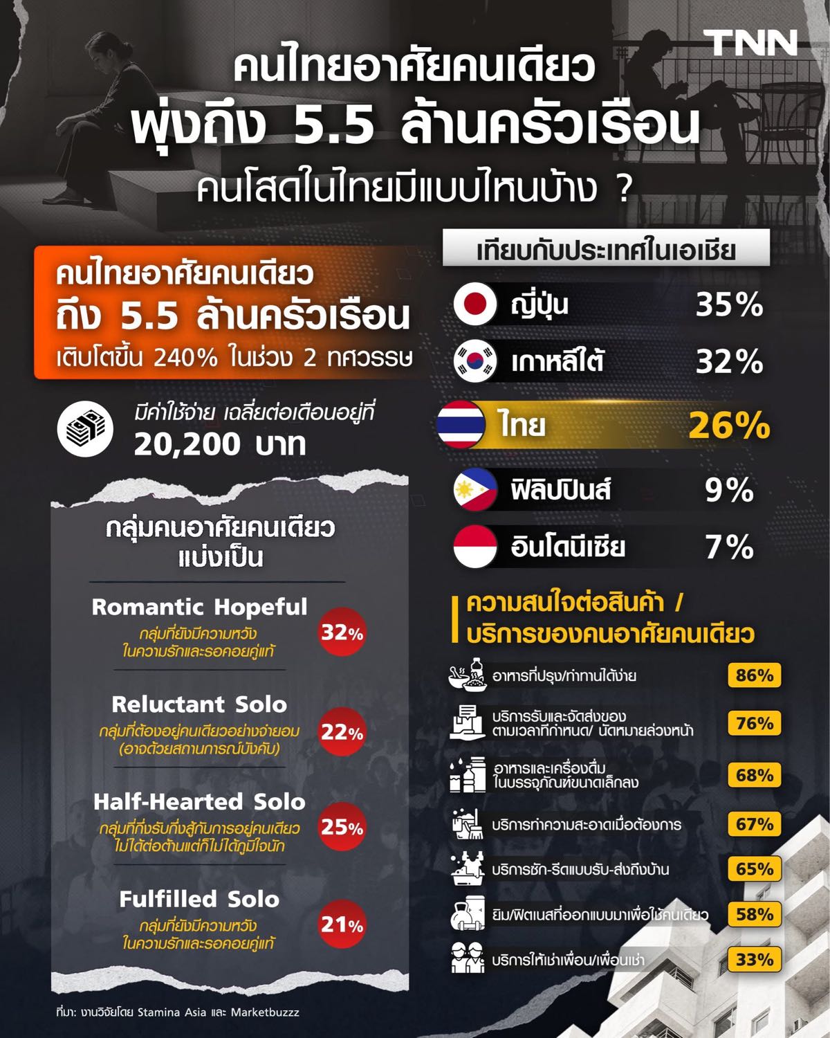 งานวิจัยจาก Stamina Asia และ Marketbuzz พบว่า ปัจจุบันคนไทยอาศัยคนเดียวถึง 5.5 ล้านครัวเรือน โตขึ้น 240% ใน 2 ทศวรรษ โดยคนที่อาศัยคนเดียวนั้น มีค่าเฉลี่ยการใช้จ่ายต่อเดือนที่ 20,200 บาท