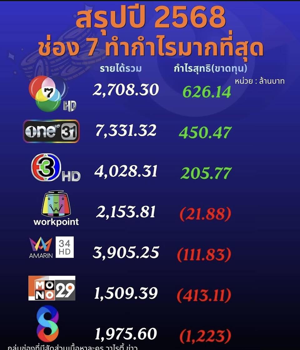 1 ช่อง 7 รายได้ไม่เยอะ แต่กำไรสูงสุด แสดงว่า การลงทุนกับ เนื้อหา ค่ิอนข้างจำกัด แต่เรตติ้งทั่วประเทศยังยืนหนึ่ง ทำให้มีรายได้แบบเก็บบุญเก่ารับประทาน