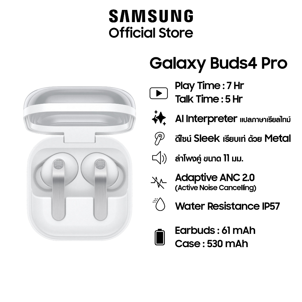 จุดเด่นที่น่าสนใจคือฟังเพลงได้นานสูงสุด 7 ชั่วโมง คุยสายได้สูงสุด 5 ชั่วโมง กันน้ำระดับ IP57 มี AI Interpreter และ Super Clear Call ช่วยให้การสื่อสารสะดวกขึ้น ตัวหูฟังมีให้เลือกสี Black / White พร้อมสินค้า คู่มือ และใบรับประกัน เหมาะกับคนใช้มือถือ Samsung คนดูหนังฟังเพลงบ่อย หรือคนที่อยากได้หูฟังตัดเสียงรบกวนสำหรับใช้งานประจำวัน 🔇