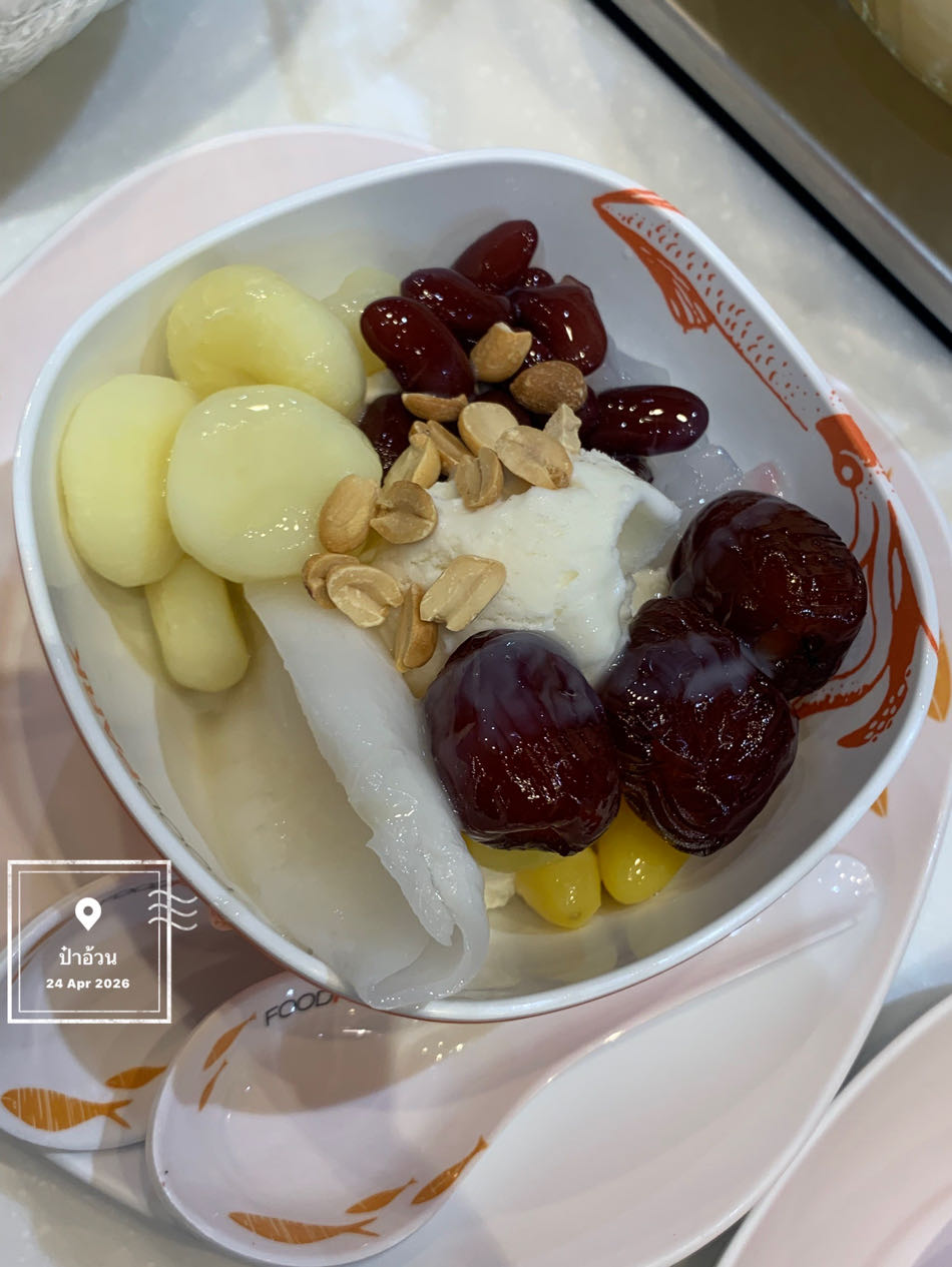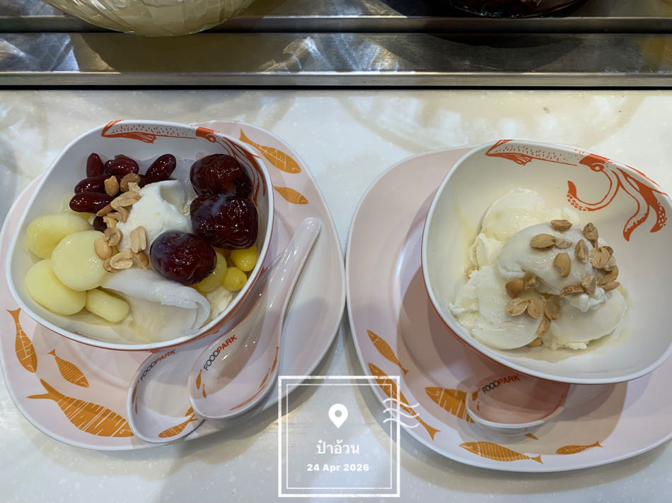 ไอติมกะทิ ใส่เครื่อง 6 (ถั่วแดงต้ม, แห้วต้ม, เนื้อมะพร้าวต้ม, ลูกตาล, แป๊ะก๊วย, พุทราเชื่อม, ราดนมข้นโรยถั่วลิสงคั่ว)