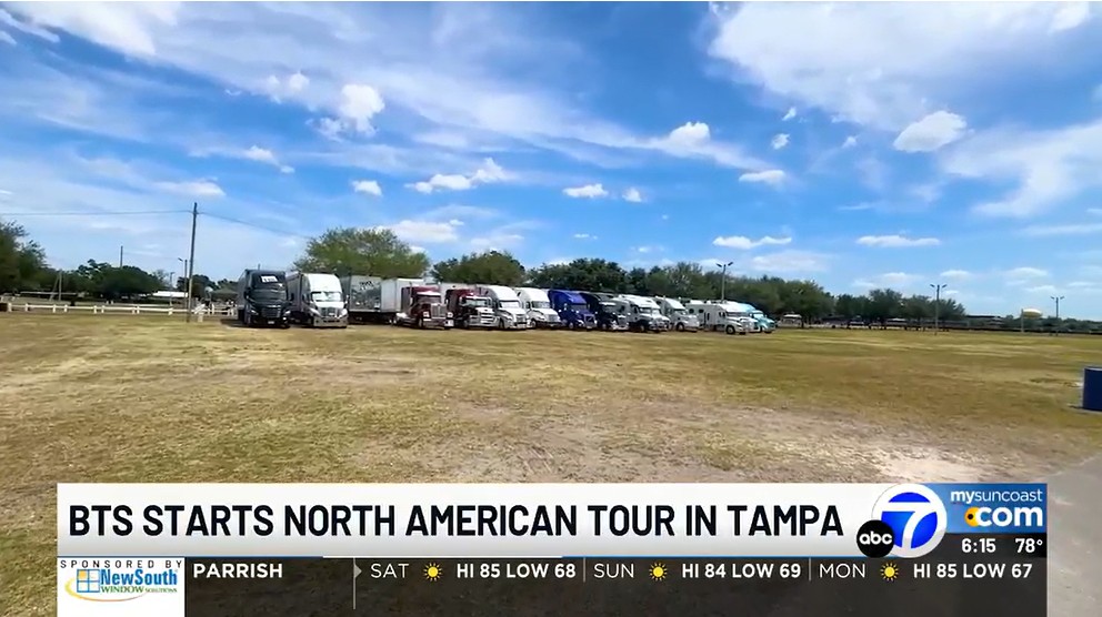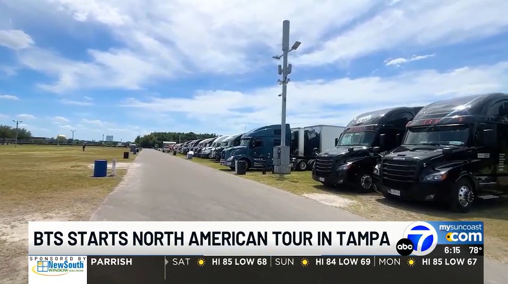 รถบรรทุกขนาดใหญ่กว่า 90 คันที่บรรทุกอุปกรณ์เวที แสง สี เสียง และเครื่องแต่งกายของวง BTS ได้จอดอยู่ที่สนามกีฬาเรย์มอนด์ เจมส์ ตั้งแต่ช่วงสุดสัปดาห์อีสเตอร์เป็นต้นมา