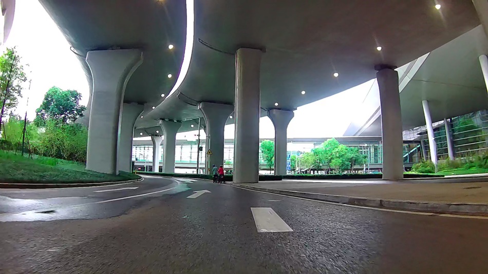 ลงลิฟต์ แล้วเข็นมาที่ถนน เริ่มปั่นไปตามทางที่จะวนซ้ายแล้วผ่านอาคาร Terminal 2