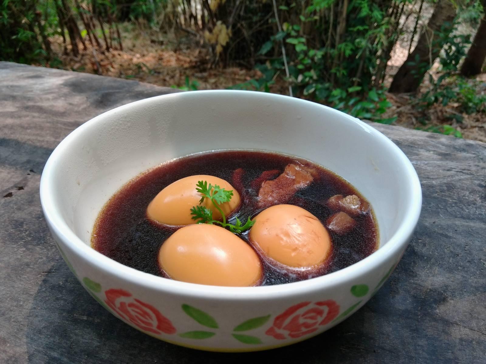 - เมื่อน้ำดำได้ที่ก็ใส่เนื้อหมูที่เตรียมไว้ พอเนื้อหมูสุกก็ใส่ไข่ต้มลงไป ปรุงรสด้วยน้ำตาลและตัดเกลือเล็กน้อย รอให้ทุกอย่างสุกเข้ากัน และไข่เปลี่ยนเป็นสีน้ำตาลก็ตักเสิร์ฟได้เลย 💓