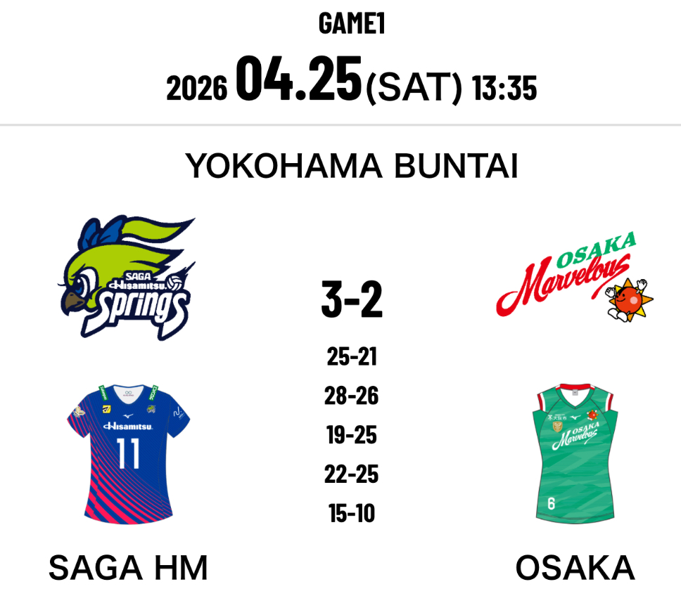 SAGA Hisamitsu Springs 3-2 Osaka Marvelous (25-21 28-26 19-25 22-25 15-10)