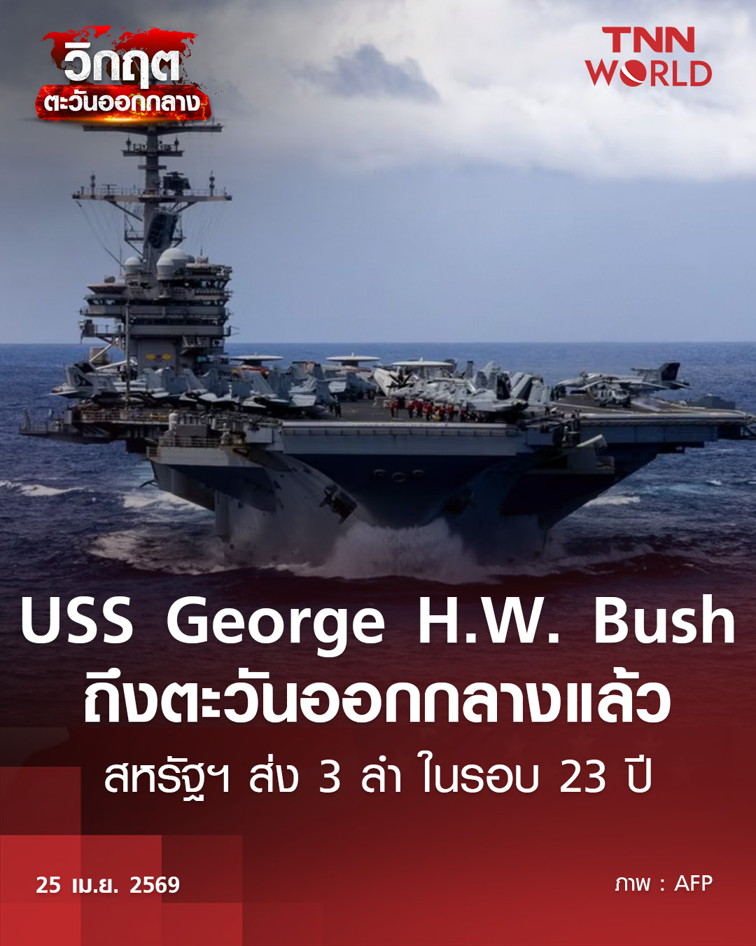 กองบัญชาการกลางสหรัฐฯ หรือ CENTCOM กล่าวเมื่อวานนี้ (24 เมษายน) ว่า กองเรือของสหรัฐฯ ที่เพิ่งเดินทางถึงนอกจาก USS George HW Bush แล้วยังประกอบด้วยเรือสนับสนุน 12 ลำ เครื่องบินกว่า 200 ลำ และกำลังพลอีกไม่ต่ำกว่า 15,000 นาย ซึ่งอาจเป็นการส่งสัญญาณว่าสหรัฐฯ กำลังเตรียมการกลับมาโจมตีอิหร่านหรือไม่ แม้ว่าในขณะนี้จะอยู่ในช่วงหยุดยิงระหว่างสหรัฐฯ และอิหร่าน อีกทั้งยังเป็นช่วงเวลาเดียวกับที่เจ้าหน้าที่ของอิหร่านและสหรัฐฯ มุ่งหน้าไปยังกรุงอิสลามาบัดของปากีสถาน ที่ยังคงไม่ชัดเจนและเป็นที่จับตามองว่าจะเกิดการเจรจาสันติภาพขึ้นอีกครั้งหรือไม่