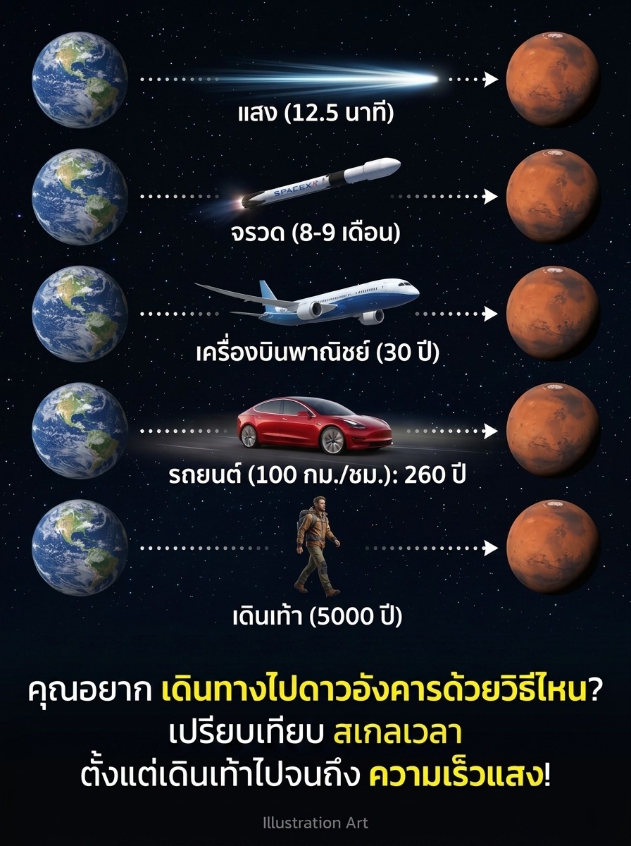 คุณอยากเดินทางไปดาวอังคารด้วยวิธีไหน? เปรียบเทียบสเกลเวลา ตั้งแต่เดินเท้าไปจนถึง ความเร็วแสง!...