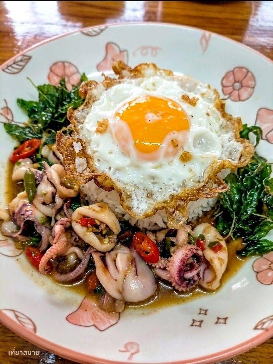🍳🌶️ หมึกผัดกะเพราราดข้าว โปะด้วยไข่ดาวเยิ้มๆ คือสวรรค์