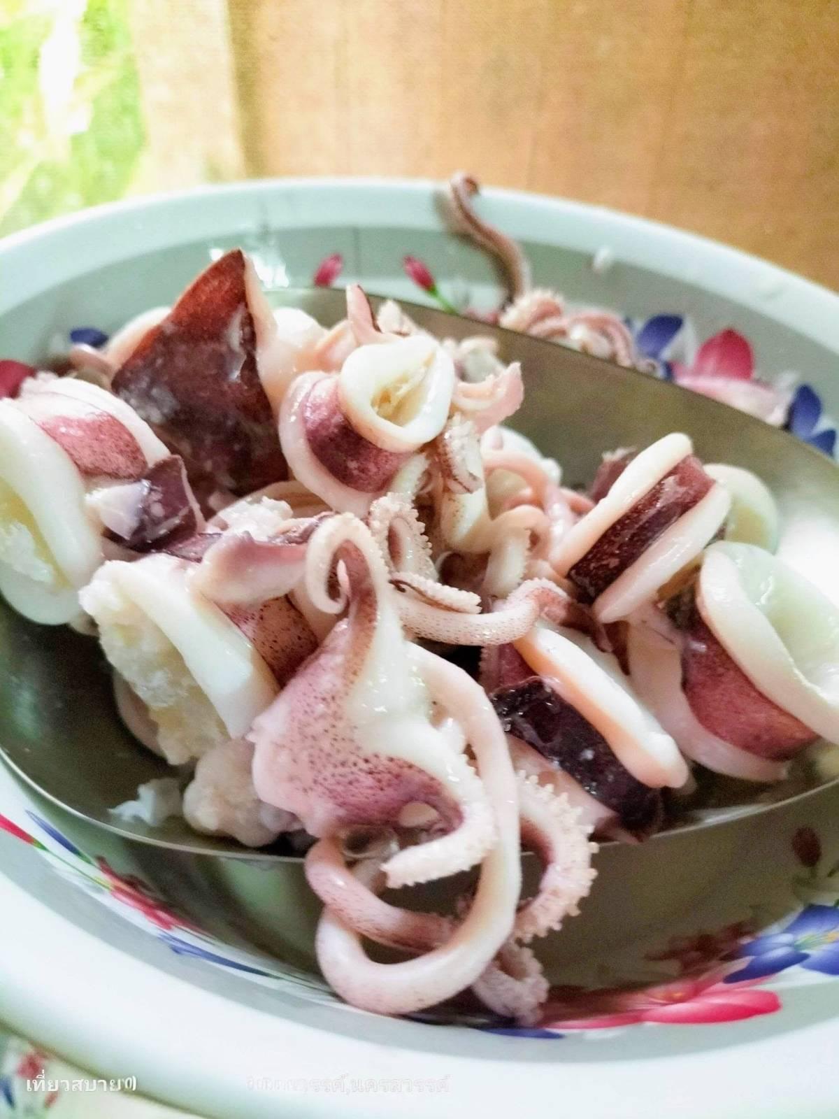 1. ปลาหมึกหั่นแว่น 300 กรัม: ลวกแป๊บเดียว พักไว้ให้สะเด็ดน้ำ (ลวกก่อน ปลาหมึกจะได้ไม่คายน้ำออกมาเยอะเกิน)