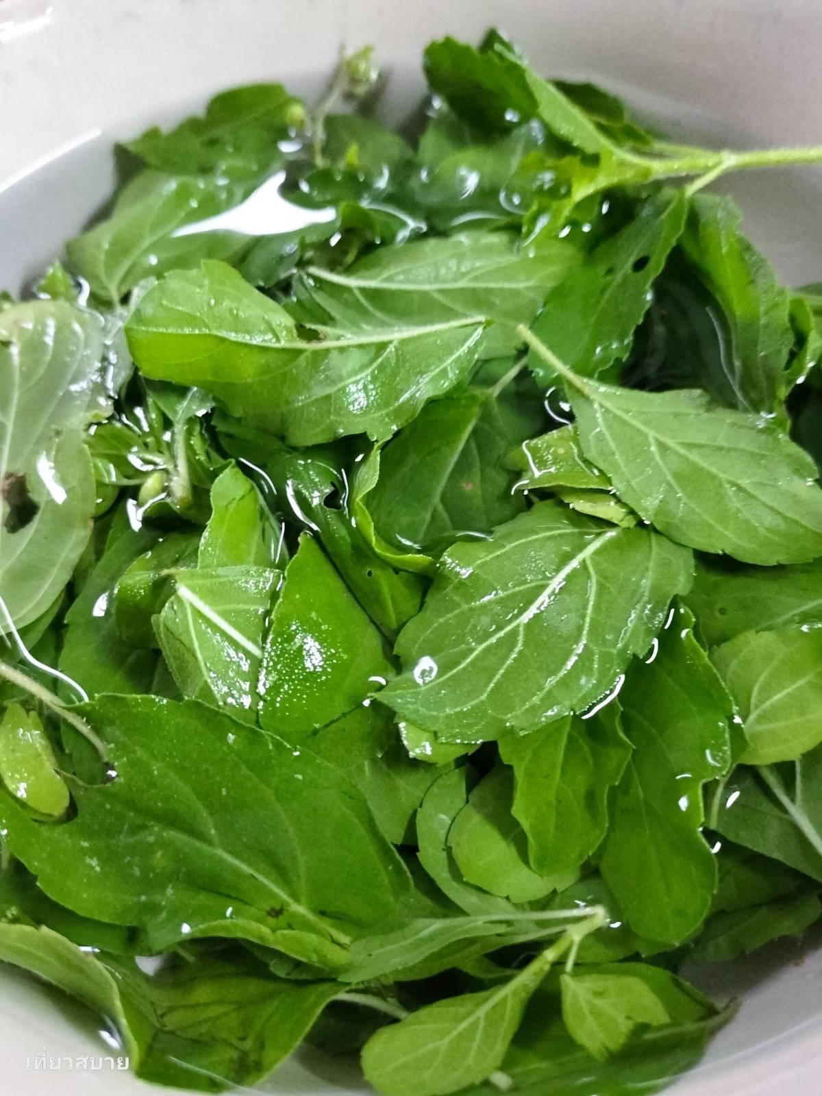 2. ใบกะเพรา: ล้างให้สะอาด เด็ดเอาแต่ใบ
