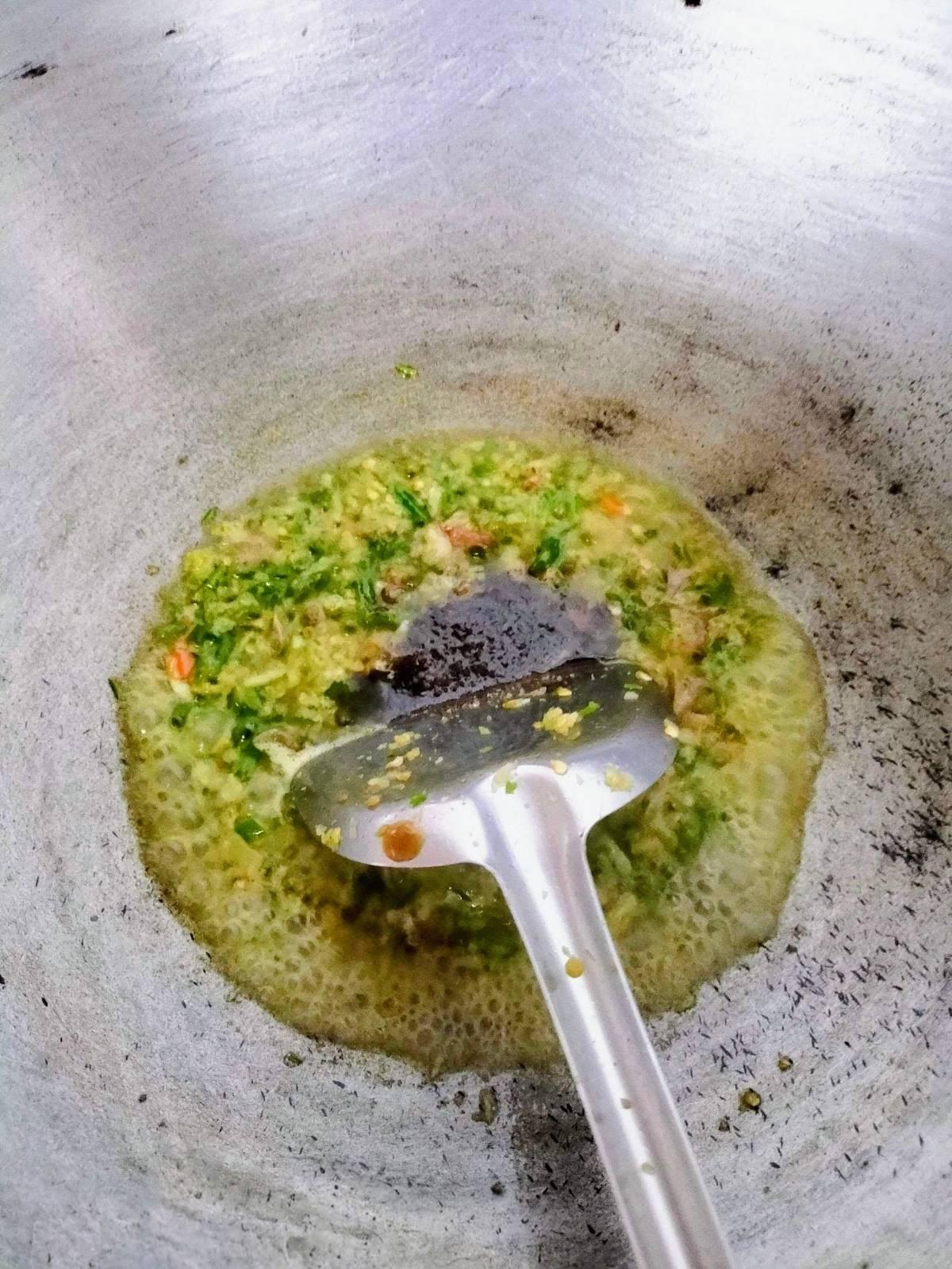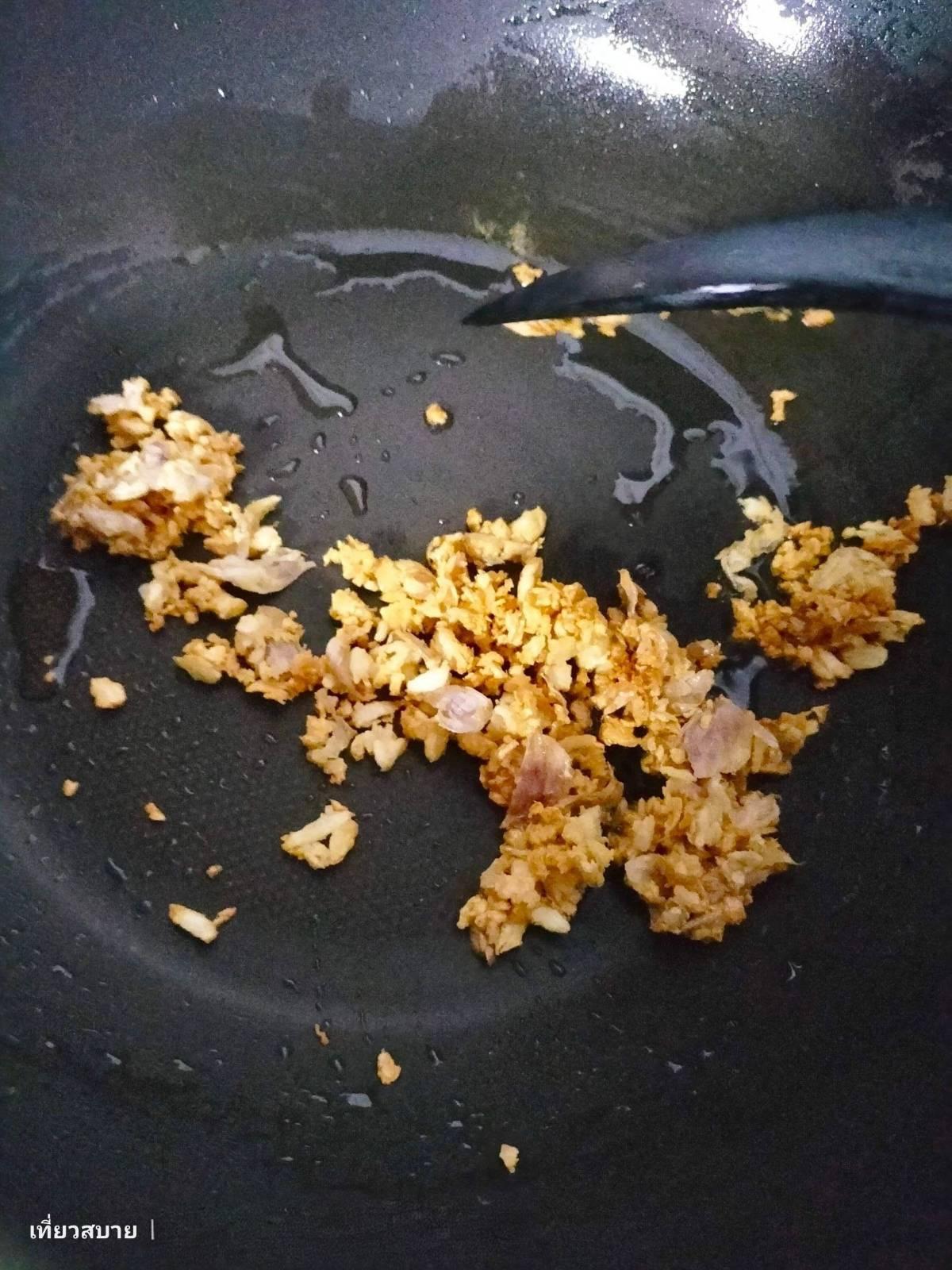 1. นำกระเทียมที่โขลกแล้วนำไปเจียวในน้ำมัน จนเป็นสีเหลืองทอง ตักขึ้นพักไว้ให้สะเด็ดน้ำมัน