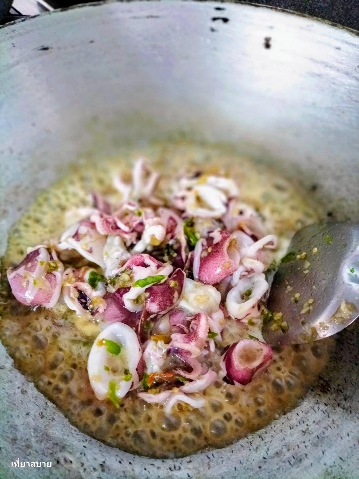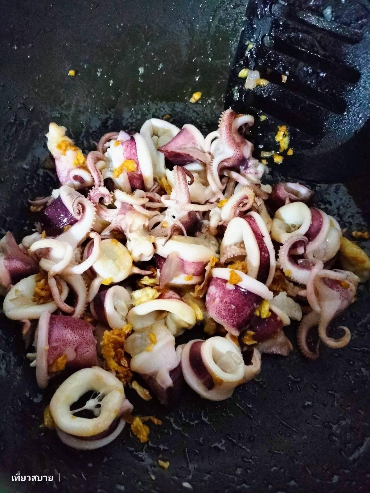 3.เอาปลาหมึกที่ลวกพักไว้ ลงไปผัดพอสุก