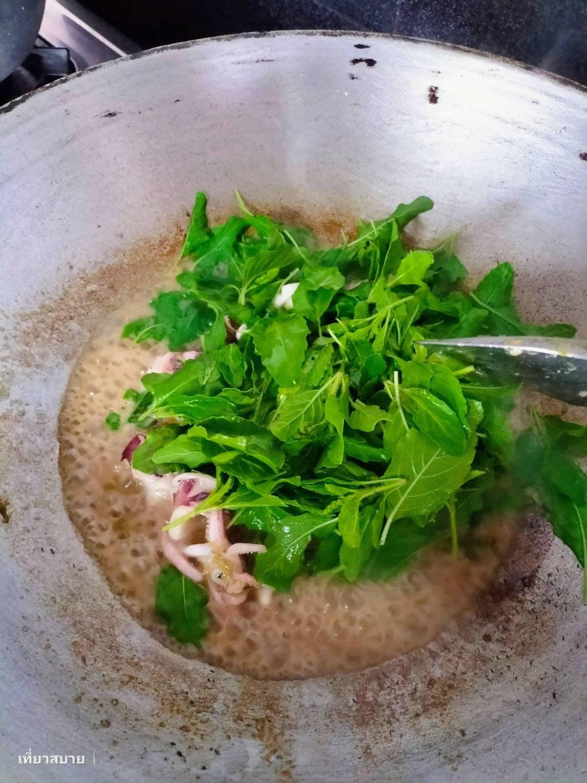 4. ใส่ใบกะเพรา ปิดไฟเลย จบ