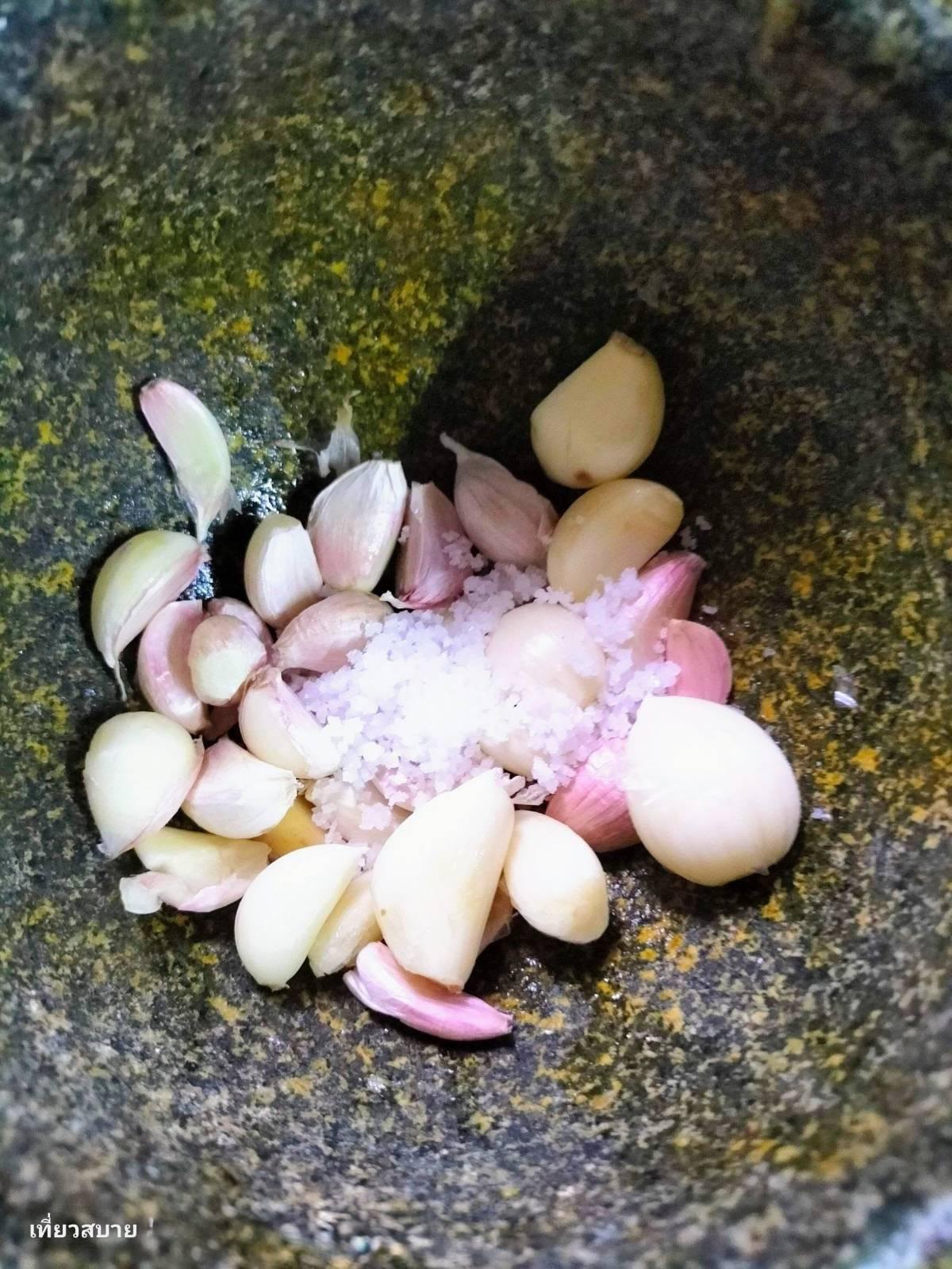 2. กระเทียม พริกไทย เกลือป่นเล็กน้อย โขลกละเอียด
