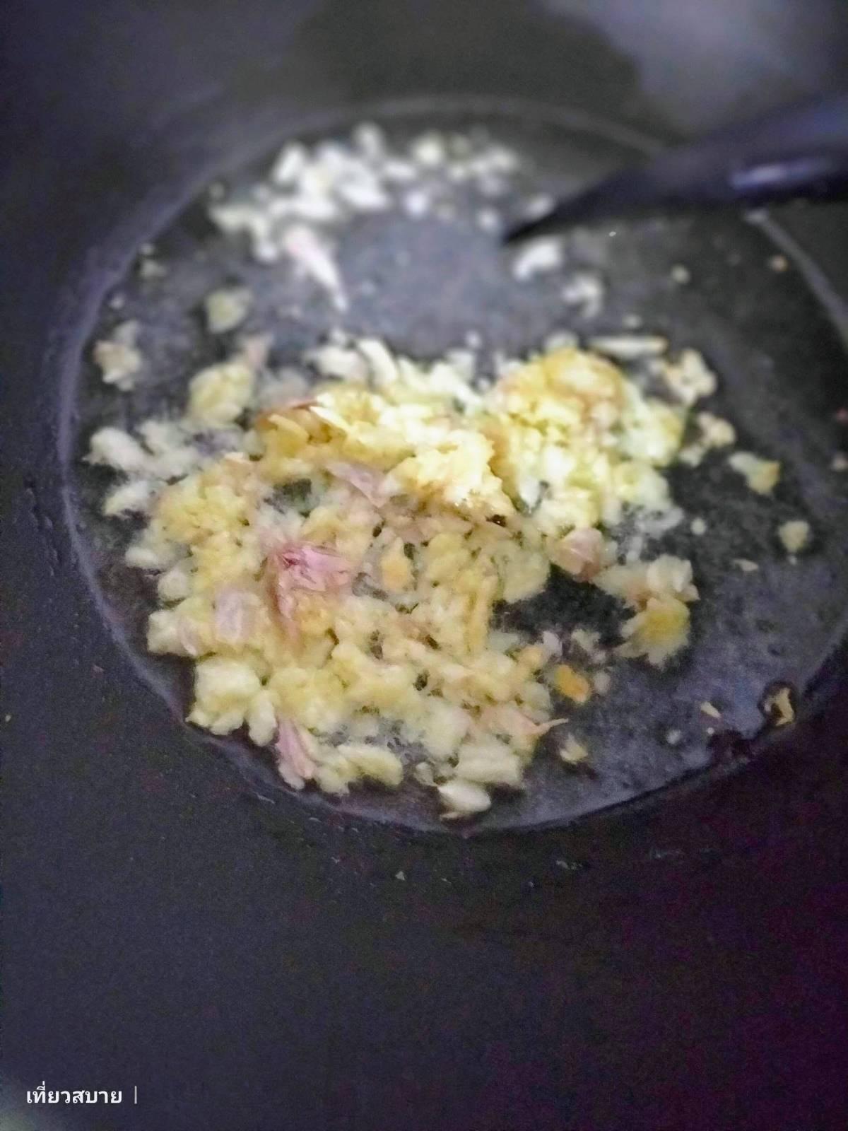 1. ตั้งกระทะ เปิดไฟแรง ใส่น้ำมัน ผัดพริกกระเทียม ผัดให้หอม