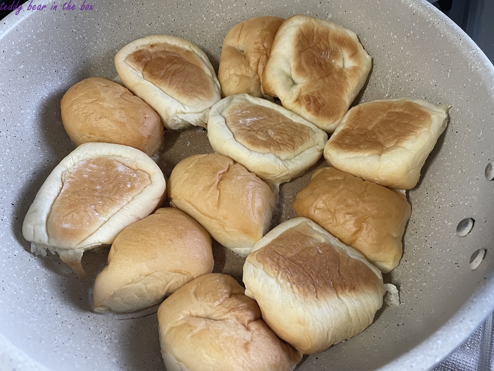 ตั้งกระทะ ใส่เนย เอาขนมปังวางทอดไฟอ่อน
