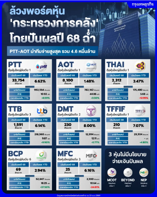 ล้วงพอร์ตหุ้น 'กระทรวงการคลัง' โกยปันผลปี 68 ฉ่ำ PTT-AOT นำทีมจ่ายสูงสุด รวมมูลค่ากว่า 4.6 หมื่นล้าน