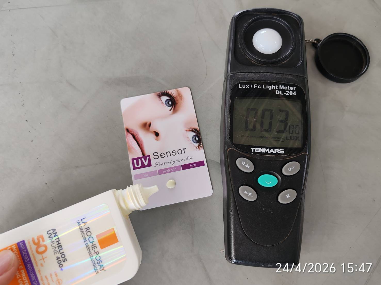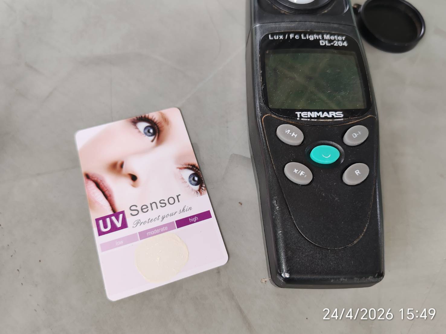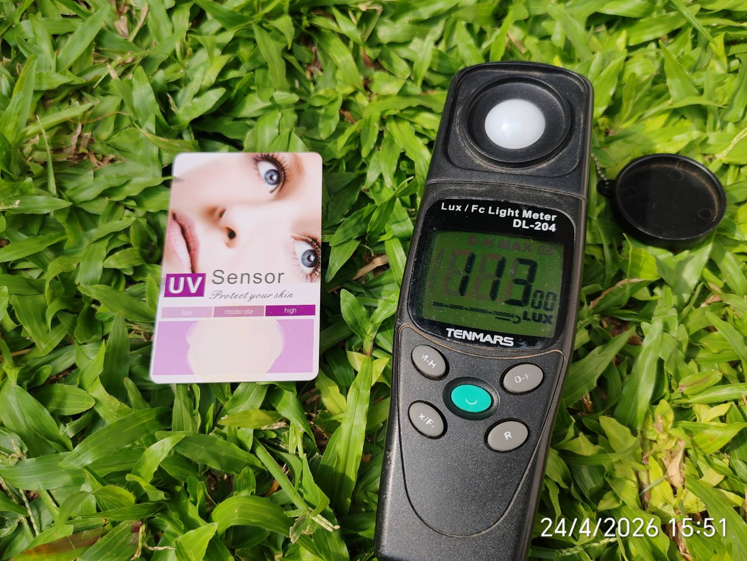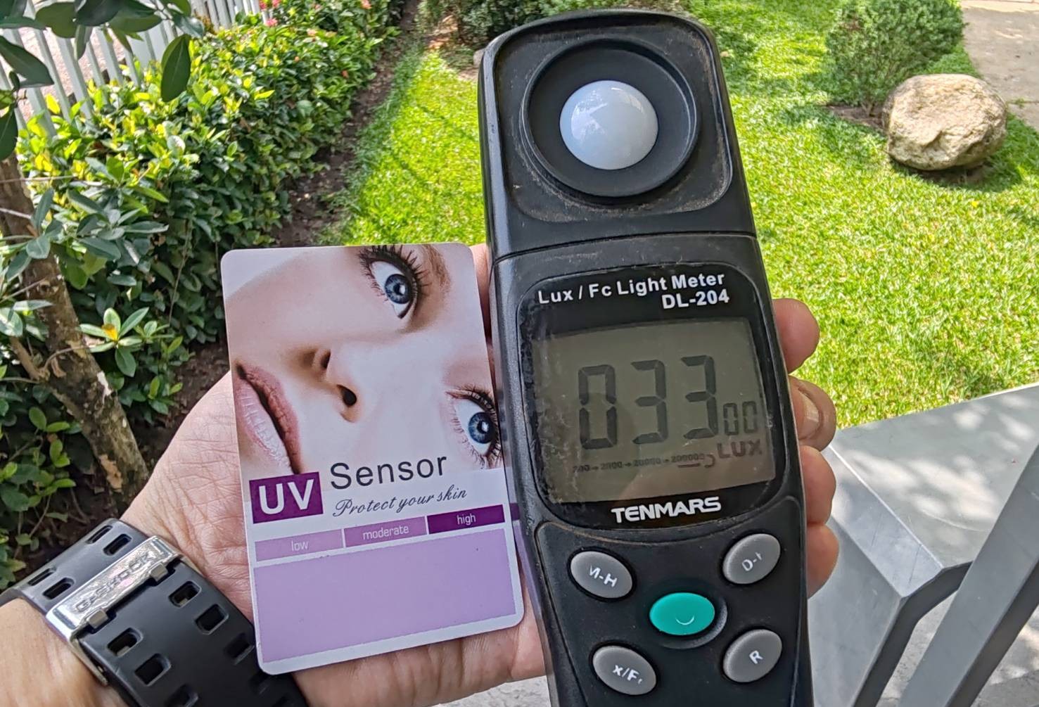 ทีนี้ไอ่เรา เด็กสายวิทยื ชอบทดลองก็ อยากรู้มันกัน UV จริงไหม เอาแผ่น UV-Sensor มาวัดละกัน จัดมา แบบนี้ น้องเพี้ยนอยากออกสื่อ 555