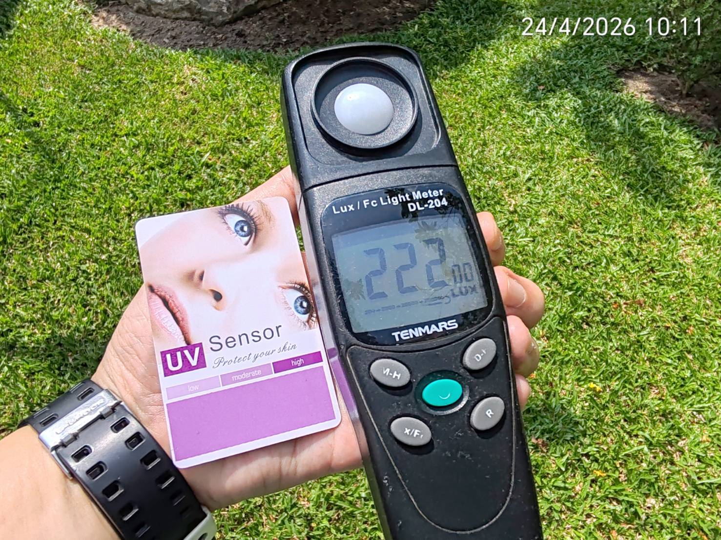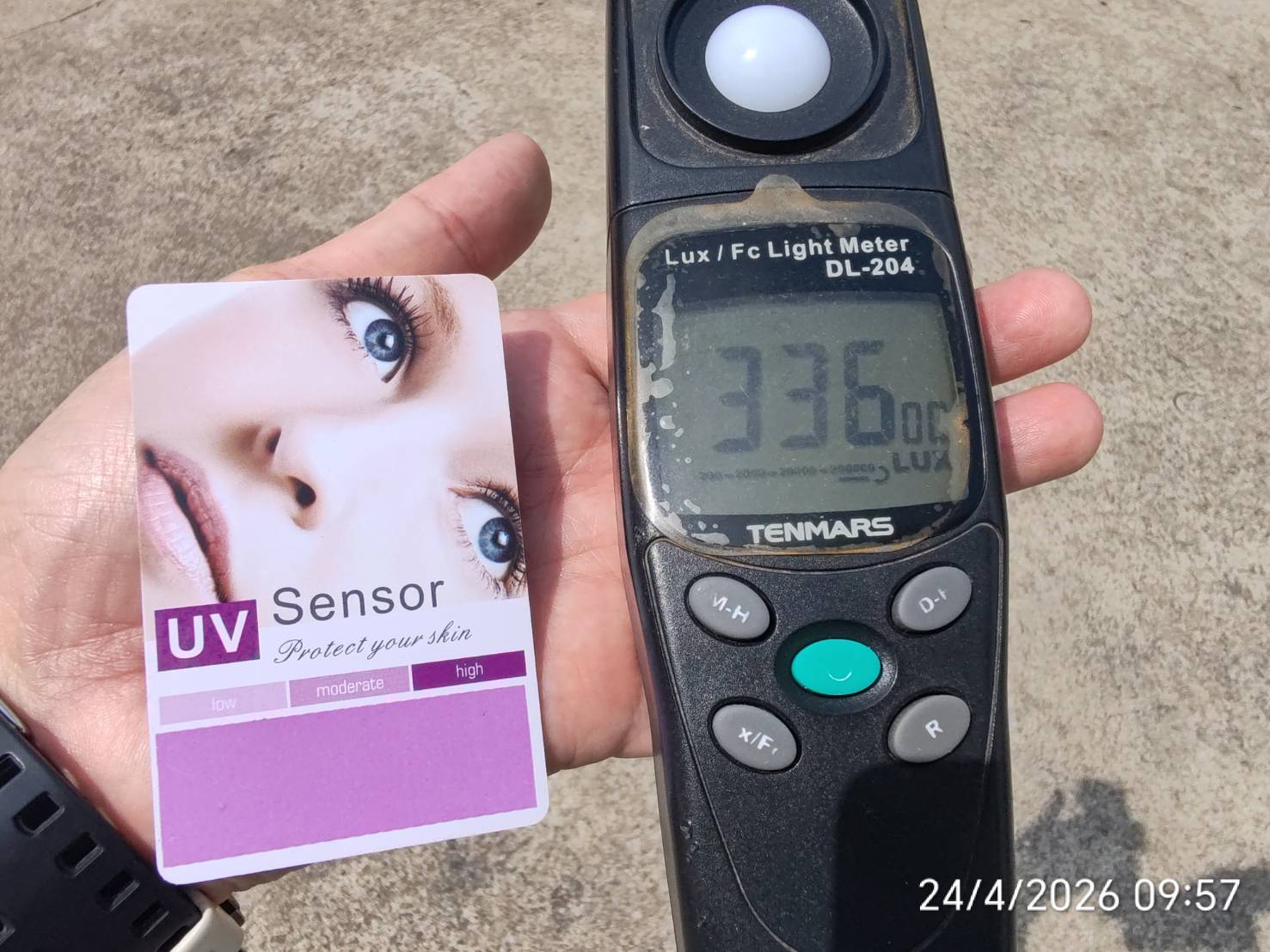 แดดมาแล้วๆ อะนี่ เอาแผ่น มา จขกท. ขอเอาเครื่องวัดแสง มาด้วยนะ Lux มิเตอร์ จริงๆมันวัด UV ไม่ได้นะครับ จขกท.ไม่มีเครื่องวัด UV เอา Lux มิเตอร์ที่มีใน Lab มาใช้ คือจะให้ดูว่า ถ้าสว่าง Lux มาก= แดดยิ่งแรง สีที่ card sensor ก็จะยิ่งม่วง ถ้า Lux น้อย= สว่างน้อย สี Card ก็ต้องอ่อน ด้วย ไม่งงนะครับ นี่อาศัยตอนแดดจ้า วัดได้ 33,600 Lux นับว่าวันนี้แดดอ่อนครับ
