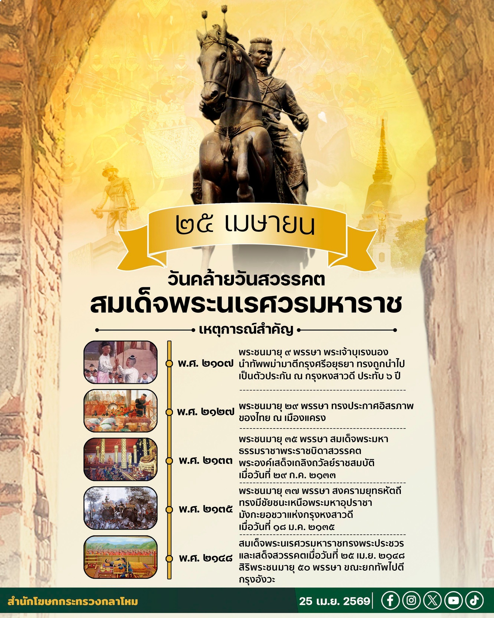 🚩ขอเชิญชวนพี่น้องปวงชนชาวไทย...ร่วมรำลึกถึงพระมหากรุณาธิคุณ องค์สมเด็จพระนเรศวรมหาราช พระมหากษัตริย์นักรบผู้ยิ่งใหญ่และกล้าหาญ โดยพระองค์ได้ #กอบกู้อิสรภาพของไทย จากการเสียกรุงศรีอยุธยาครั้งแรก และได้ทรงแผ่อำนาจของราชอาณาจักรไทย อย่างกว้างใหญ่ไพศาล | ทรงเสด็จสวรรคตเมื่อวันที่ 25 เมษายน พ.ศ. 2148 สิริพระชนมายุ 50 พรรษา ในระหว่างยกทัพไปราชการศึกสงคราม