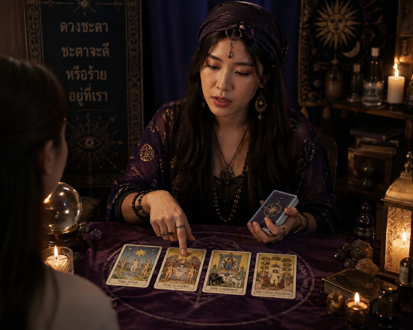 ตัวอย่างการทำนาย (ความรัก): 1. สถานการณ์ปัจจุบัน 2. ความสัมพันธ์ของเรา 3. ความสัมพันธ์ของอีกฝ่าย 4. แนวโน้ม/สรุป