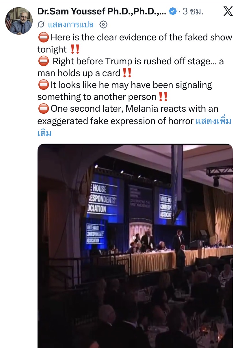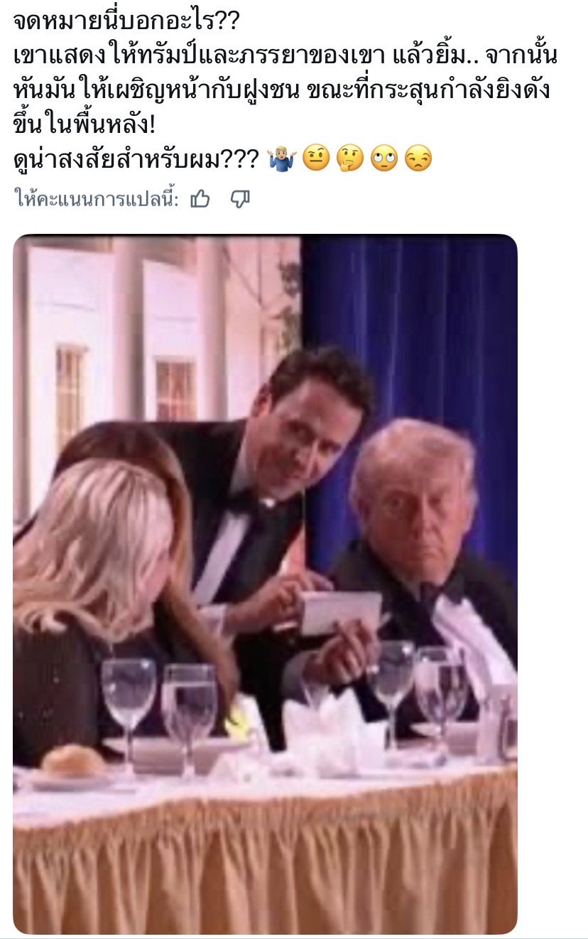 รายละเอียดเหตุการณ์กราดยิงช่วงเวลาระหว่างจัดงานเลี้ยงอาหารค่ำสมาคมผู้สื่อข่าวทำเนียบขาว (White House Correspondents’ Dinner) เมื่อคืนวันเสาร์ที่ 25 เมษายน 2026 ที่ผ่านมา