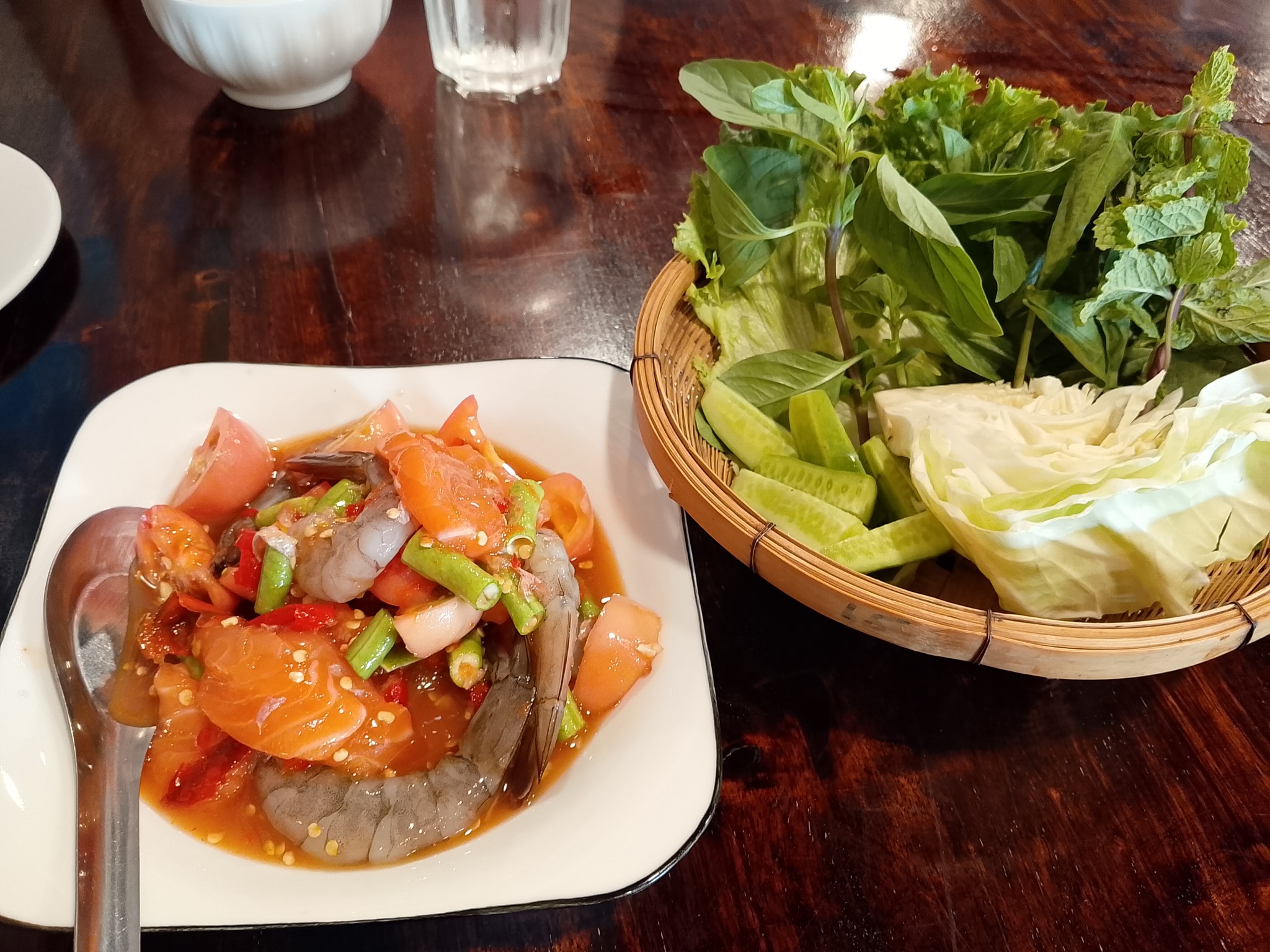 เหลาแซลมอนกุ้งสด กุ้งกรอบข้นหวานอ่อน แซลมอนหอมมัน รสน้ำยำหวานอมเปรี้ยวเข้มๆ