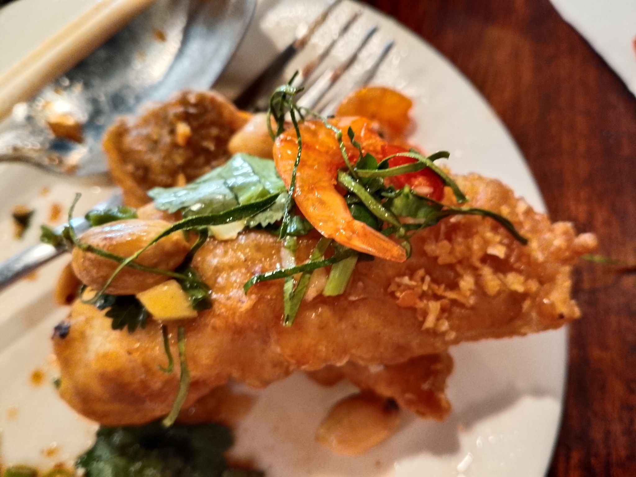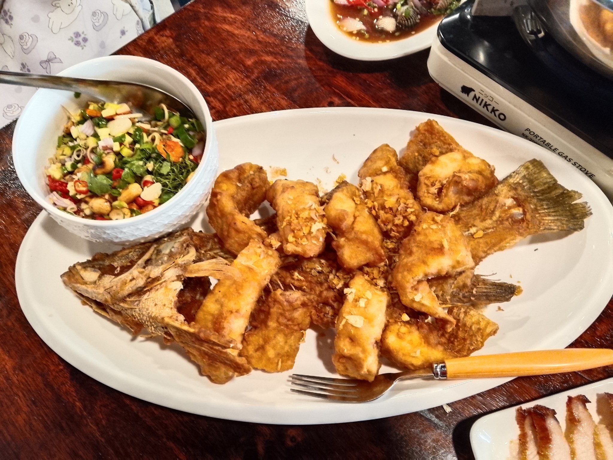 แป้งทอดมากรอบกรุ๊บๆยังกับกินไก่ทอดเลย สมุนไพรสับพวกตะไคร้ หอมซอย และกุ้งแห้งก็ช่วยเสริมให้ปลาทอดรสชาติเด่น เคี้ยวเพลิน