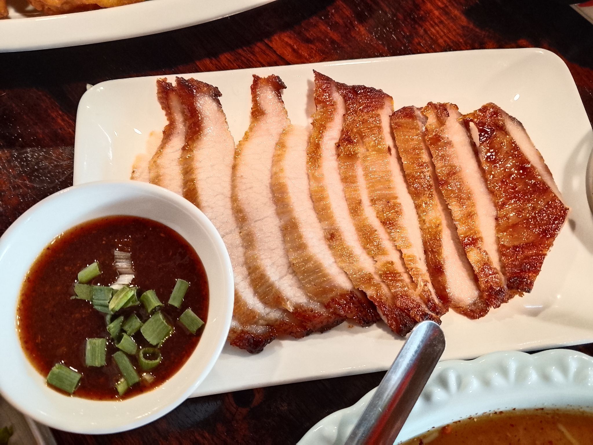 คอหมูย่างแบบธรรมดา เนื้อนิ่มๆ รสหวานอมเค็มกลางๆ กลิ่นหมูใช้ได้ น้ำจิ้มเปรี้ยวเผ็ดแบบอ่อนกว่าของชุดจิ้มจุ่ม