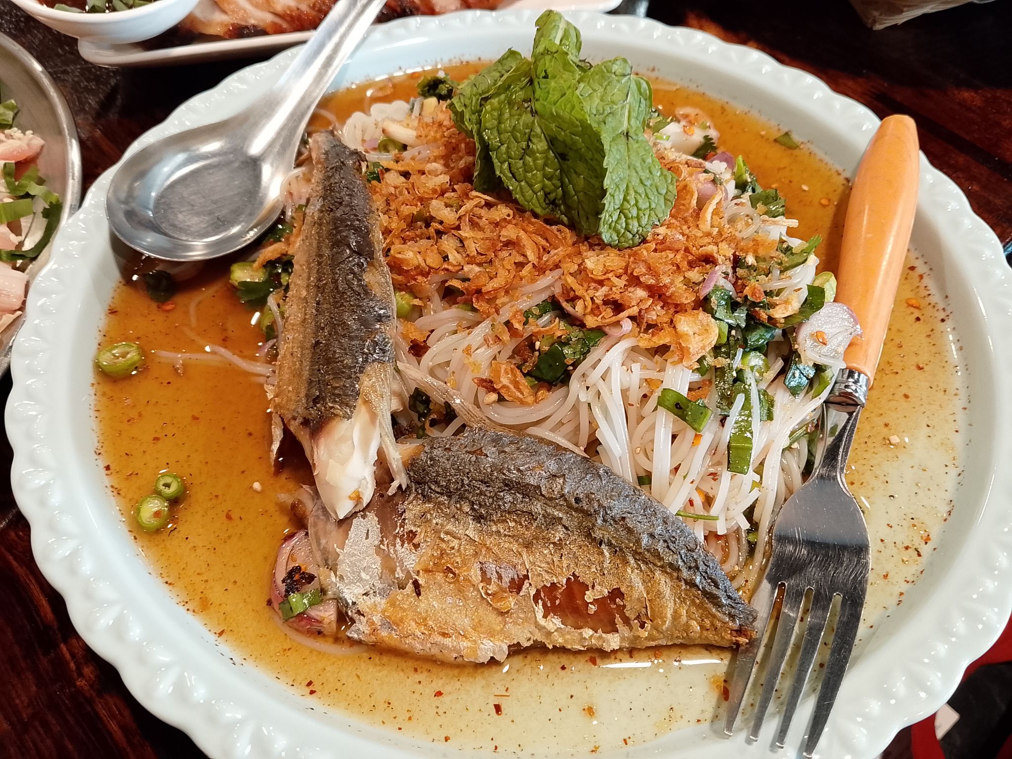 ยำขนมจีนปลาทู น้ำราดหวานหนัก ปลาทูทอดอร่อยมากเนื้อแน่น นุ่มฟู เปรี้ยวน้อยและไม่คาว เส้นขนมจีนให้มาเยอะมากกินไปท้ายๆเริ่มอืด