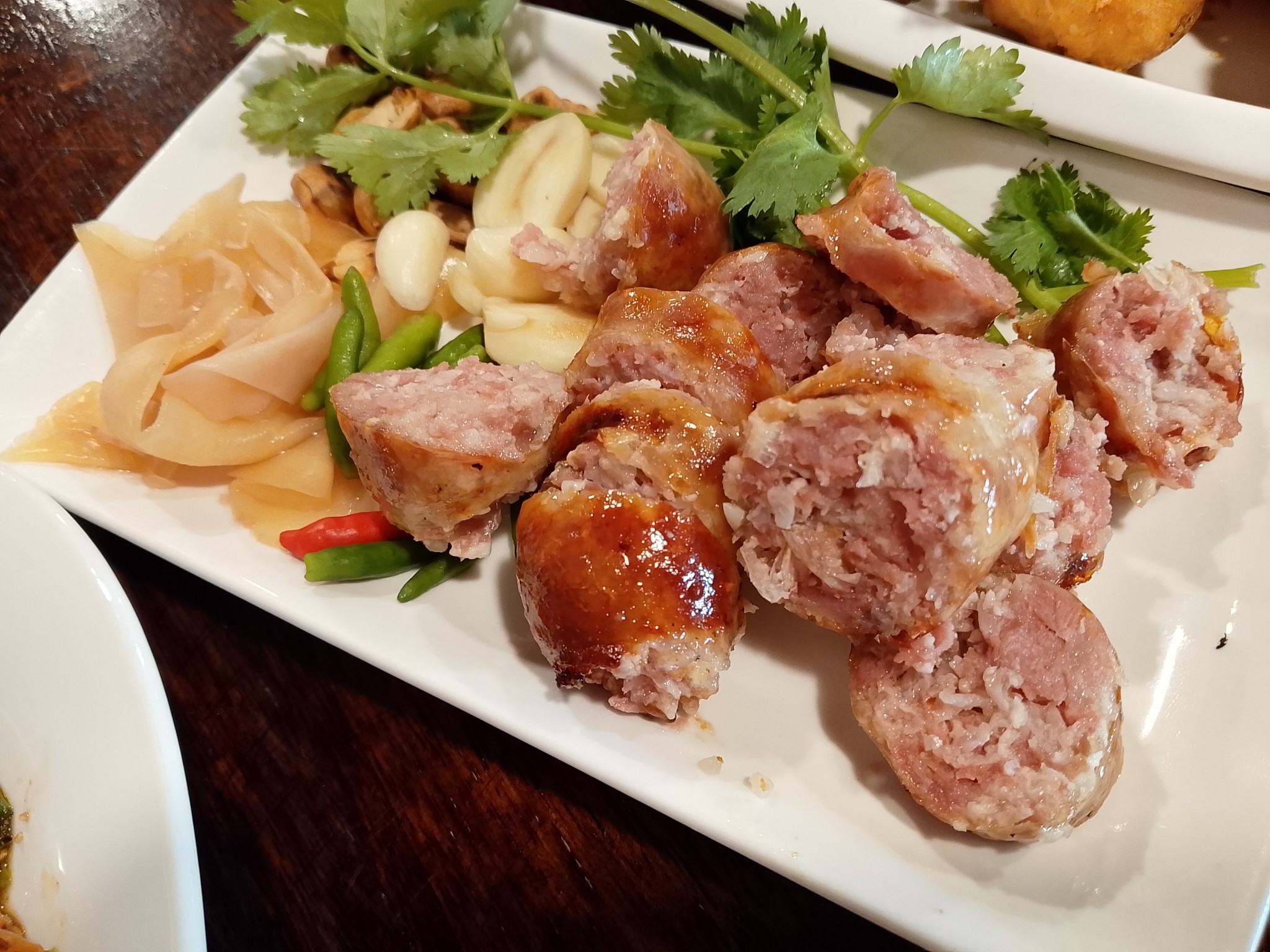 ไส้กรอกอิสาน เนื้อหมูแน่นๆ และได้ความฉ่ำด้านในของมันหมู เปลือกนอกกรอบๆ เปรี้ยวแบบพอดี ไม่หนักเกินจนหลับตาปี๋