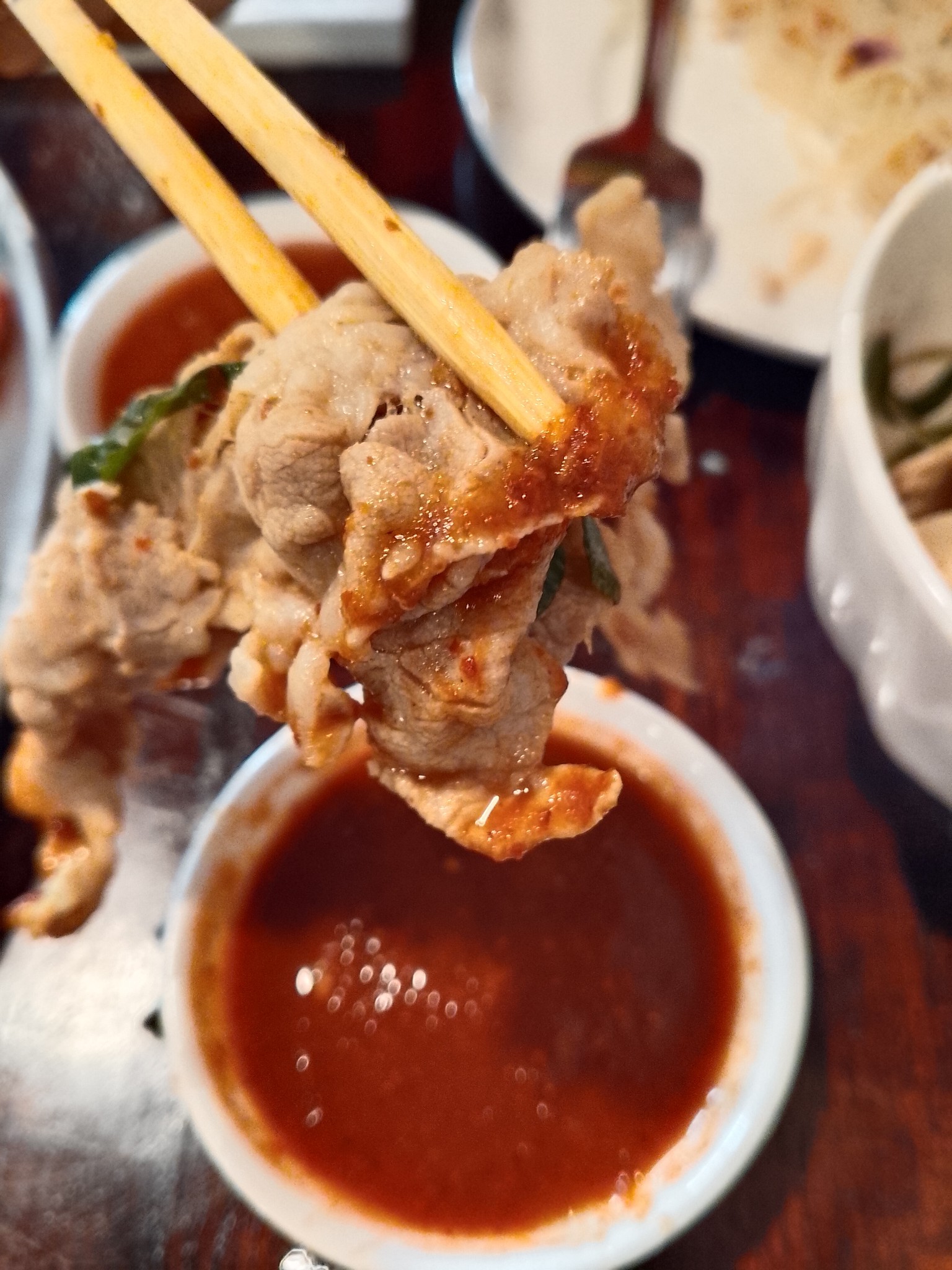 เนื้อหมูแน่นมากๆและหอมทีเดียว ส่วนน้ำจิ้มนี่เผ็ดเอาเรื่องเลย