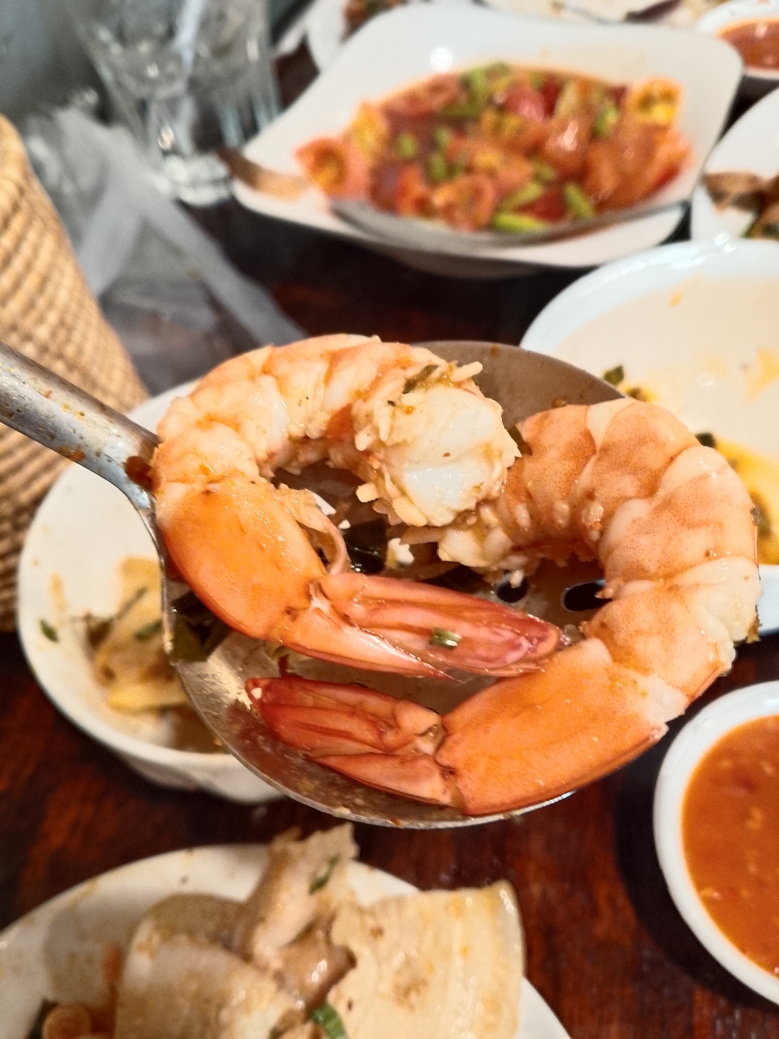 เห็นกุ้งสดตัวเบิ้มๆละอยากลองเอาไปลวกกินดู ได้รสชาติความกรอบและหวานฉ่ำอย่างมาก อาหารปริมาณมันเยอะ ไม่ได้สั่งกุ้งสะดุ้ง