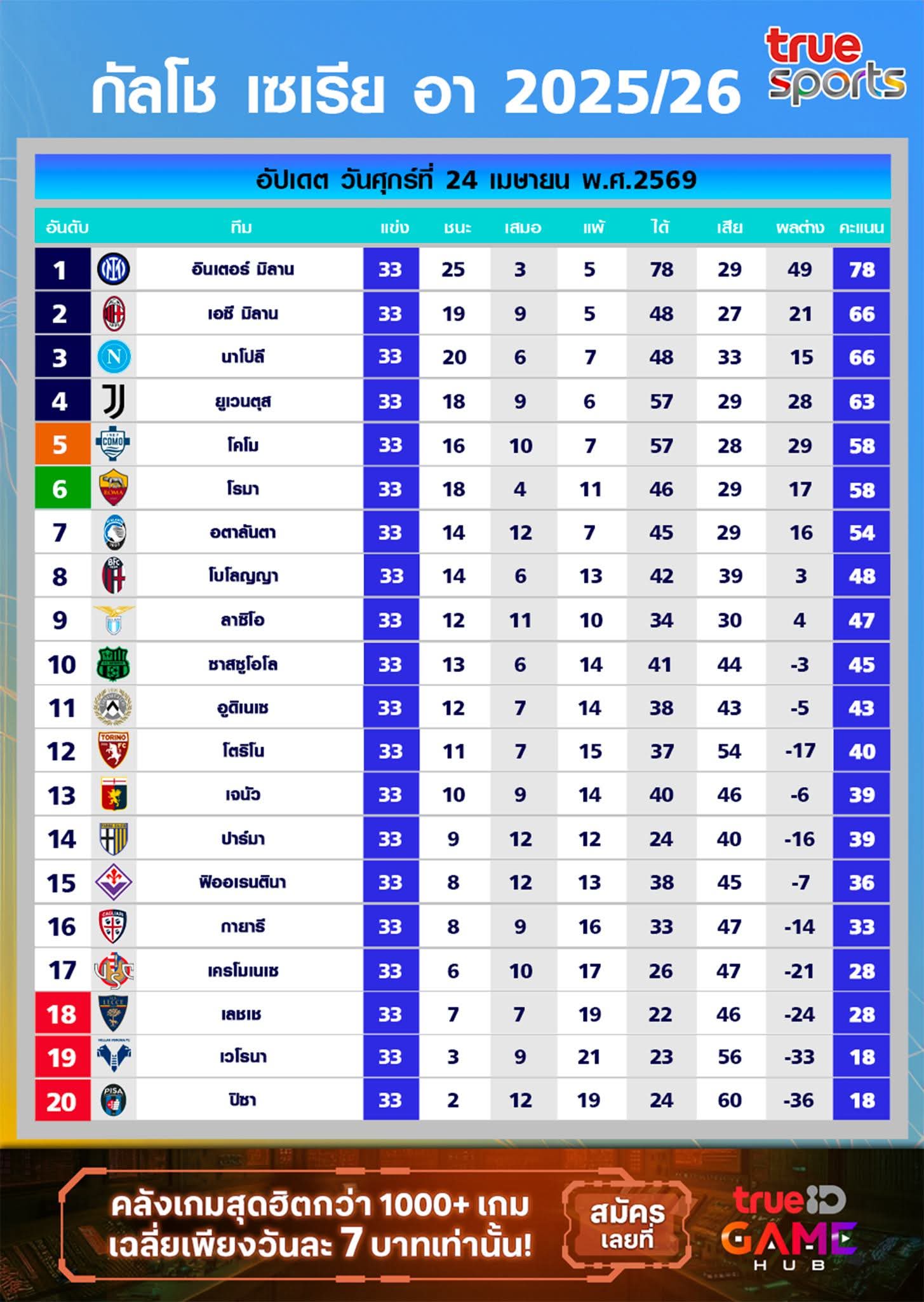 06/04/26 ชนะ เจนัว 2-0 (เหย้า) กัลโช่ เซเรีย อา