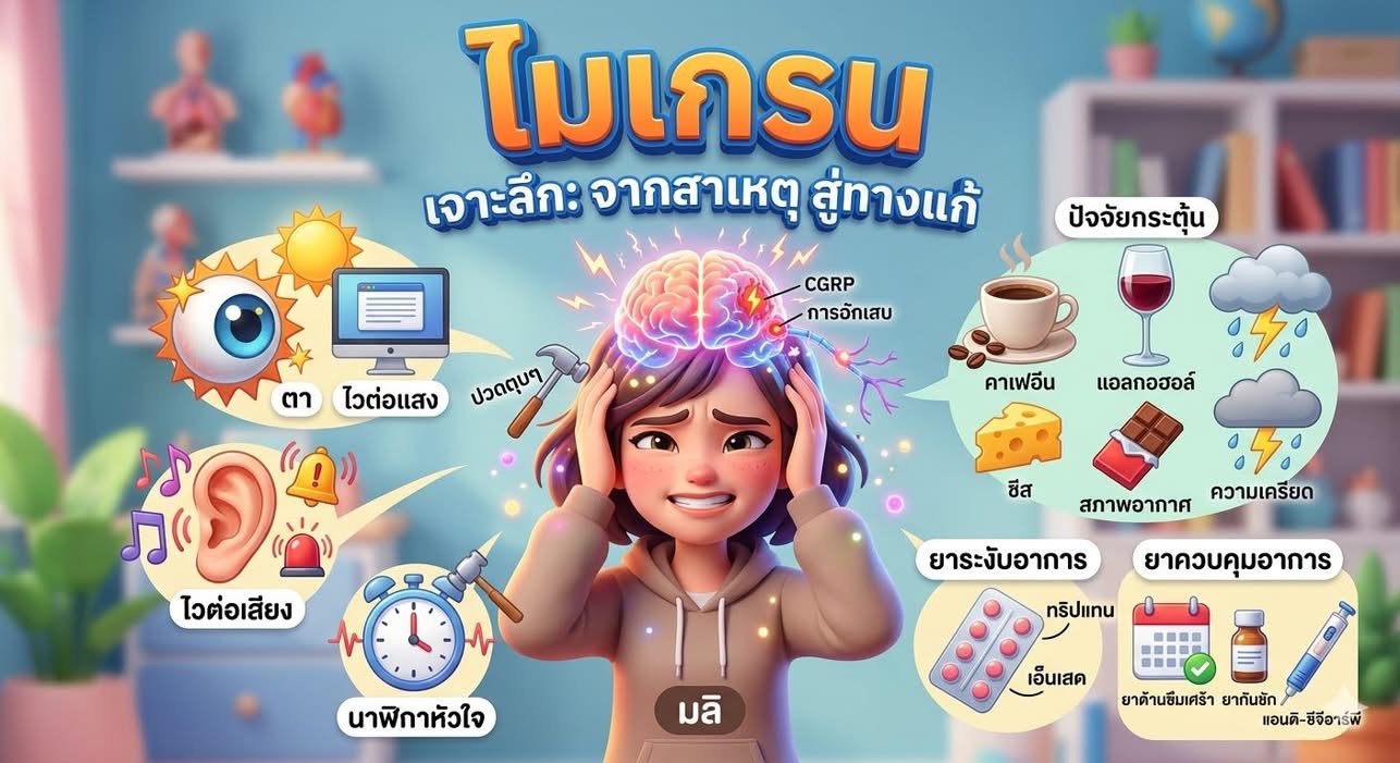 หลายคนเมื่อมีอาการปวดหัว มักจะเหมาสมมติฐานเบื้องต้นว่าตนเองเป็น "ไมเกรน" แต่ในความเป็นจริง ไมเกรนเป็นโรคที่มีกลไกซับซ้อนและมีลักษณะเฉพาะตัวมากกว่าแค่การปวดหัวธรรมดา บทความนี้จะพาไปทำความรู้จักโรคไมเกรน ตั้งแต่สาเหตุ อาการ การแยกโรค ไปจนถึงแนวทางการรักษาในปัจจุบัน