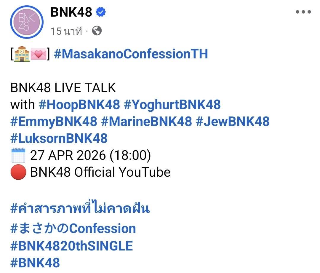 พรุ่งนี้ BNK48 มีไลฟ์ใน YouTube