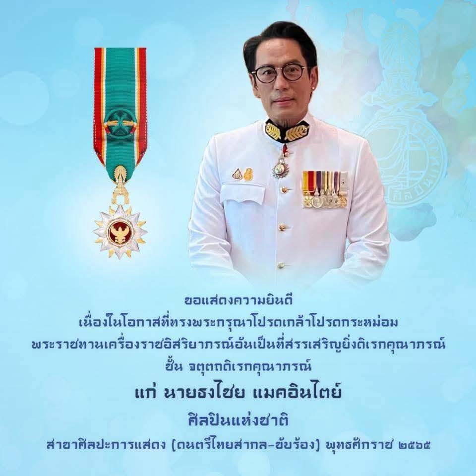 “เบิร์ด - ธงไชย แมคอินไตย์” ได้รับพระมหากรุณาธิคุณ โปรดเกล้าโปรดกระหม่อมพระราชทานเครื่องราชอิสริยาภรณ์อันเป็นที่สรรเสริญยิ่งดิเรกคุณาภรณ์ ชั้น จตุตถดิเรกคุณาภรณ์ ประจำปี ๒๕๖๘ ในฐานะศิลปินแห่งชาติ สาขาศิลปะการแสดง (ดนตรีไทยสากล-ขับร้อง) ประจำปีพุทธศักราช ๒๕๖๕ ซึ่งนับเป็นเกียรติประวัติสูงสุดและอีกหนึ่งความภาคภูมิใจในชีวิตการทำงาน ซึ่งเครื่องราชอิสริยาภรณ์ดังกล่าว สำหรับพระราชทานแก่ผู้มีความดีความชอบ อุทิศตนสร้างคุณประโยชน์แก่ประเทศชาติ ศาสนา และสังคม