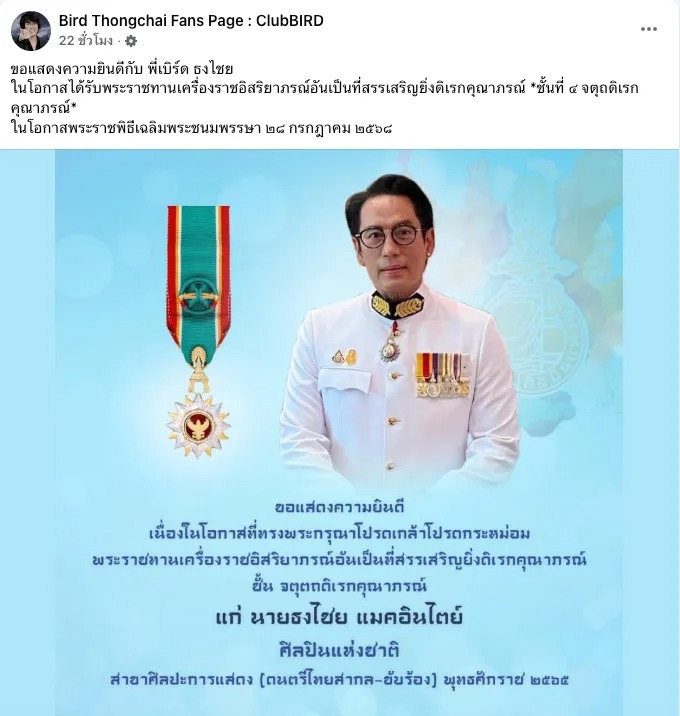 ขอแสดงความยินดีกับพี่เบิร์ด ธงไชย แมคอินไตย์ ในโอกาสได้รับพระราชทานเครื่องราชอิสริยาภรณ์อันเป็นที่สรรเสริญยิ่งดิเรกคุณาภรณ์ ชั้นที่ ๔ จตุตถดิเรกคุณาภรณ์ ในโอกาสพระราชพิธีเฉลิมพระชนมพรรษา ๒๘ กรกฎาคม ๒๕๖๘